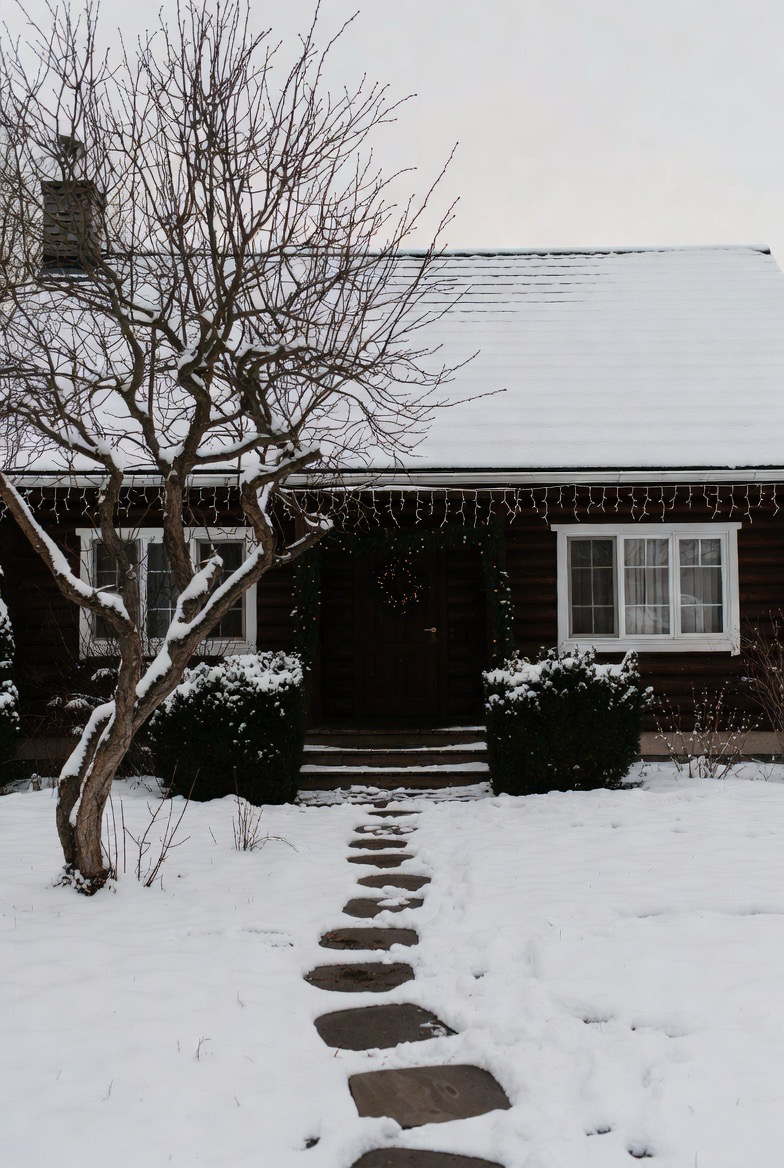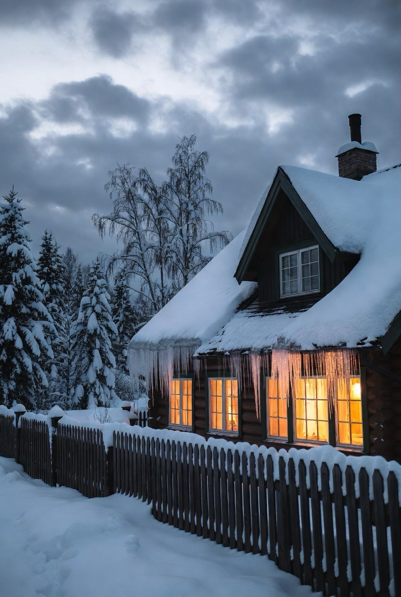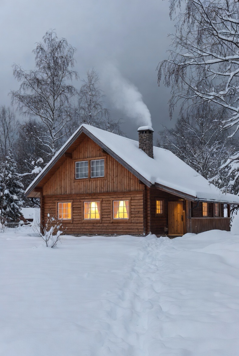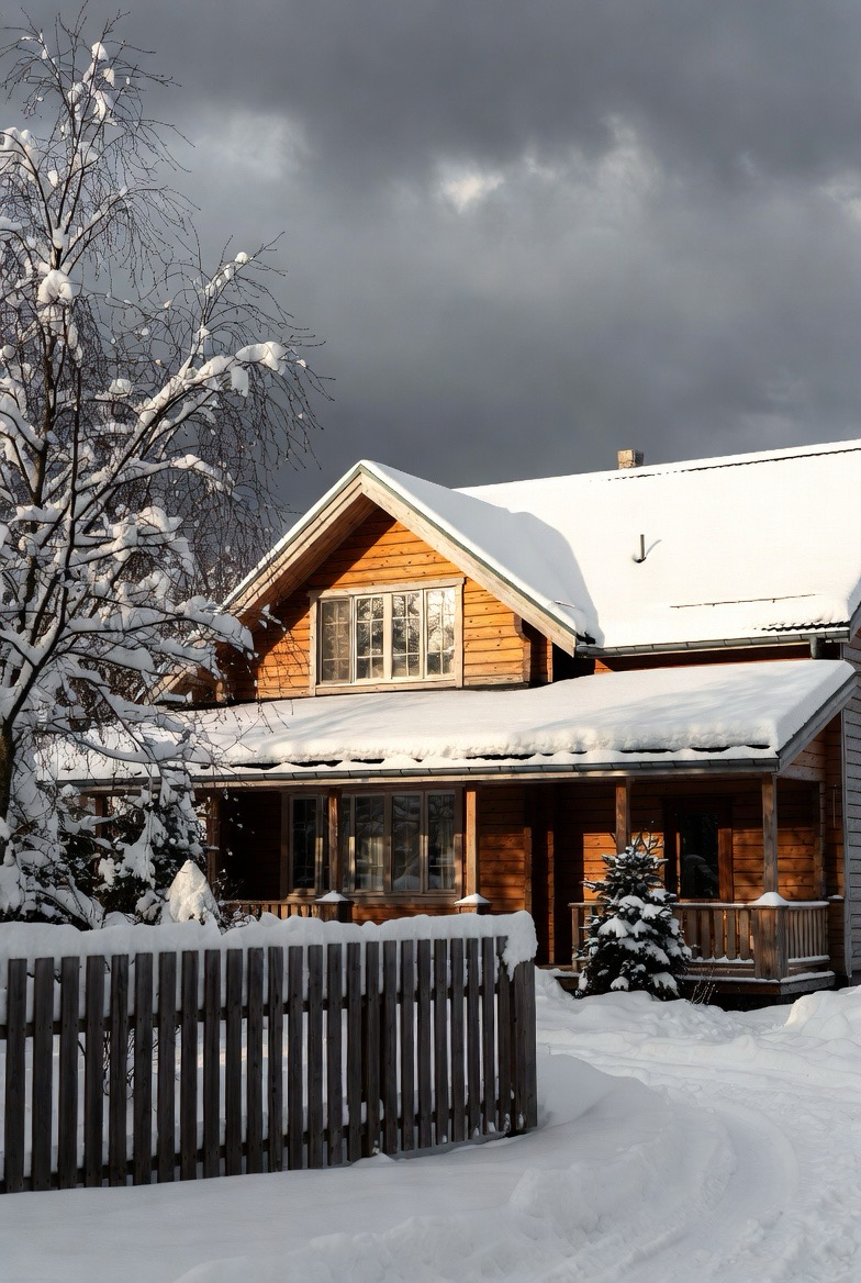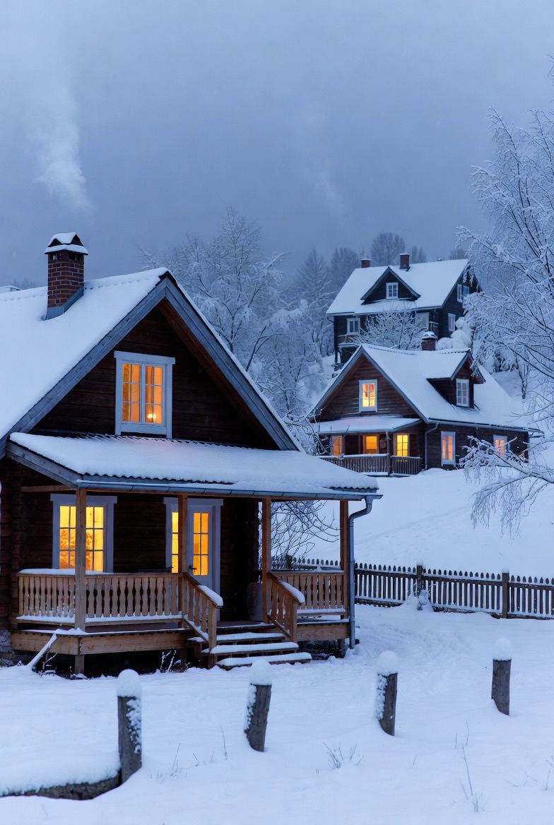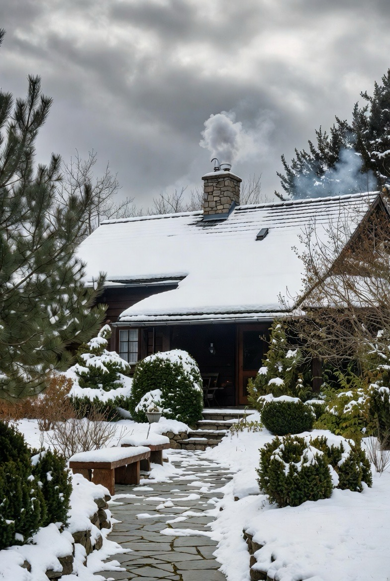 Country-style homes feel especially cozy in winter. Simple materials, warm lighting, and rustic details shine against snowy backdrops.