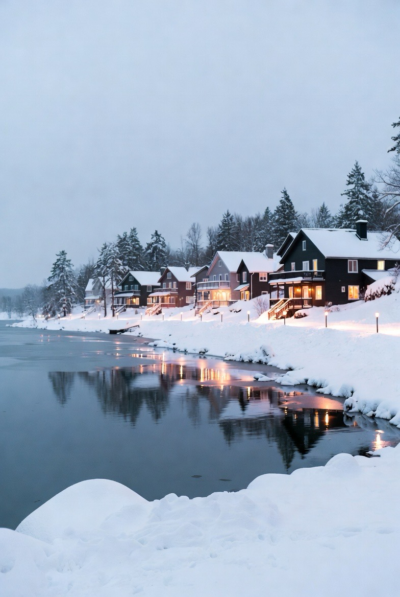 Lakeside homes feel serene in winter. Reflections of snow and light create a peaceful, magical atmosphere.