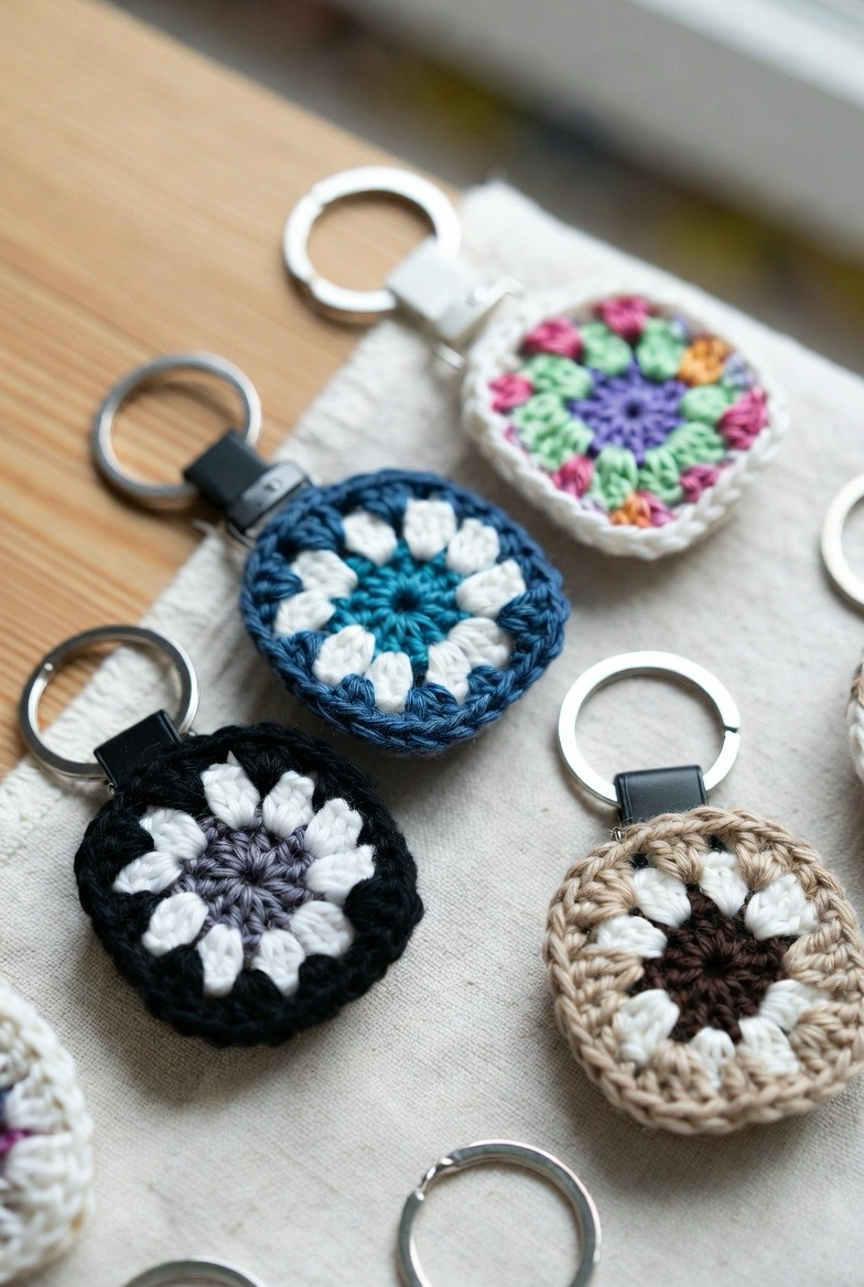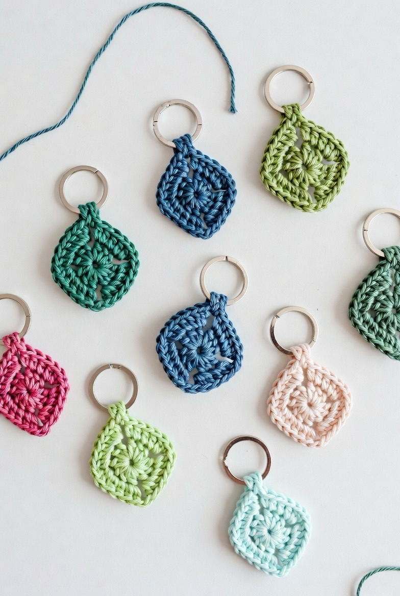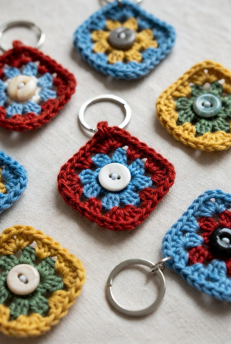 Turn classic granny squares into modern keychains. A great way to reuse leftover yarn.