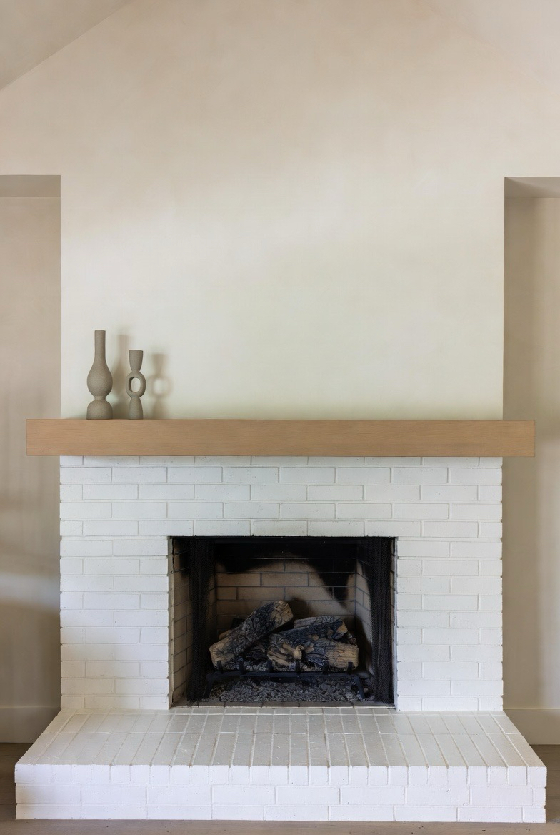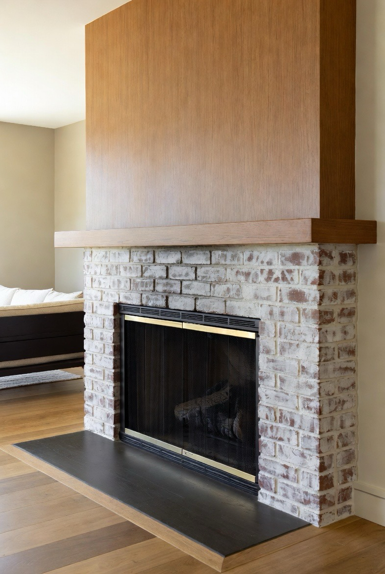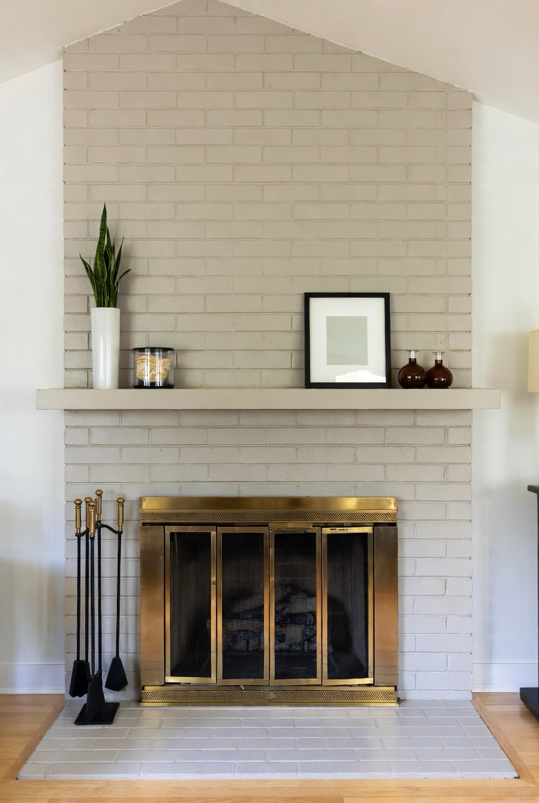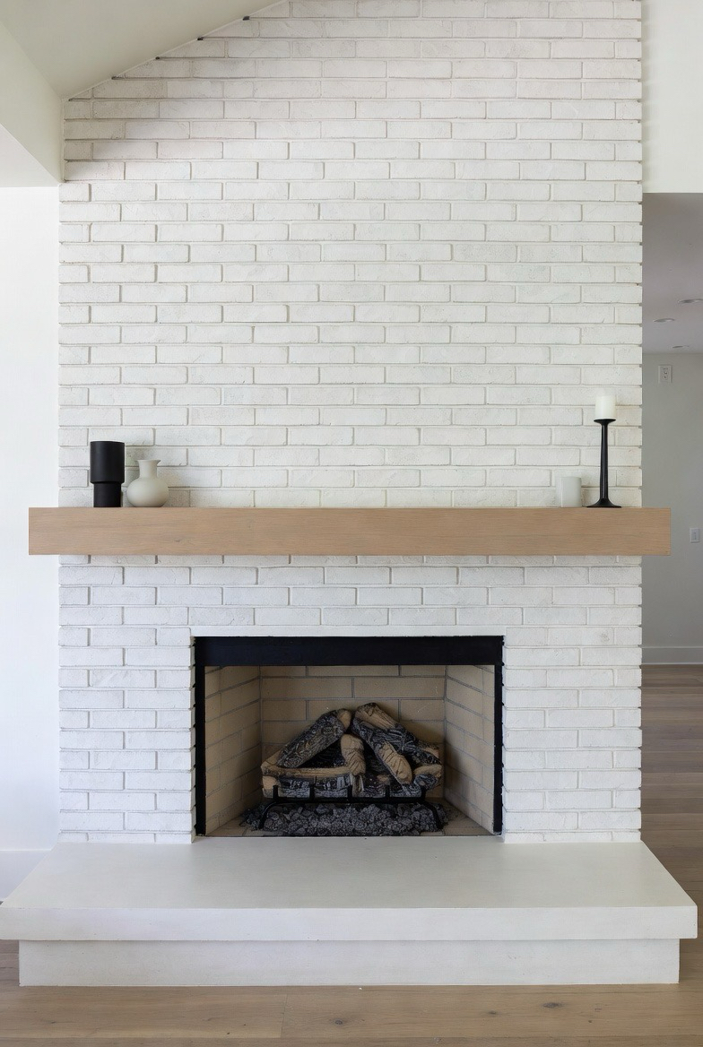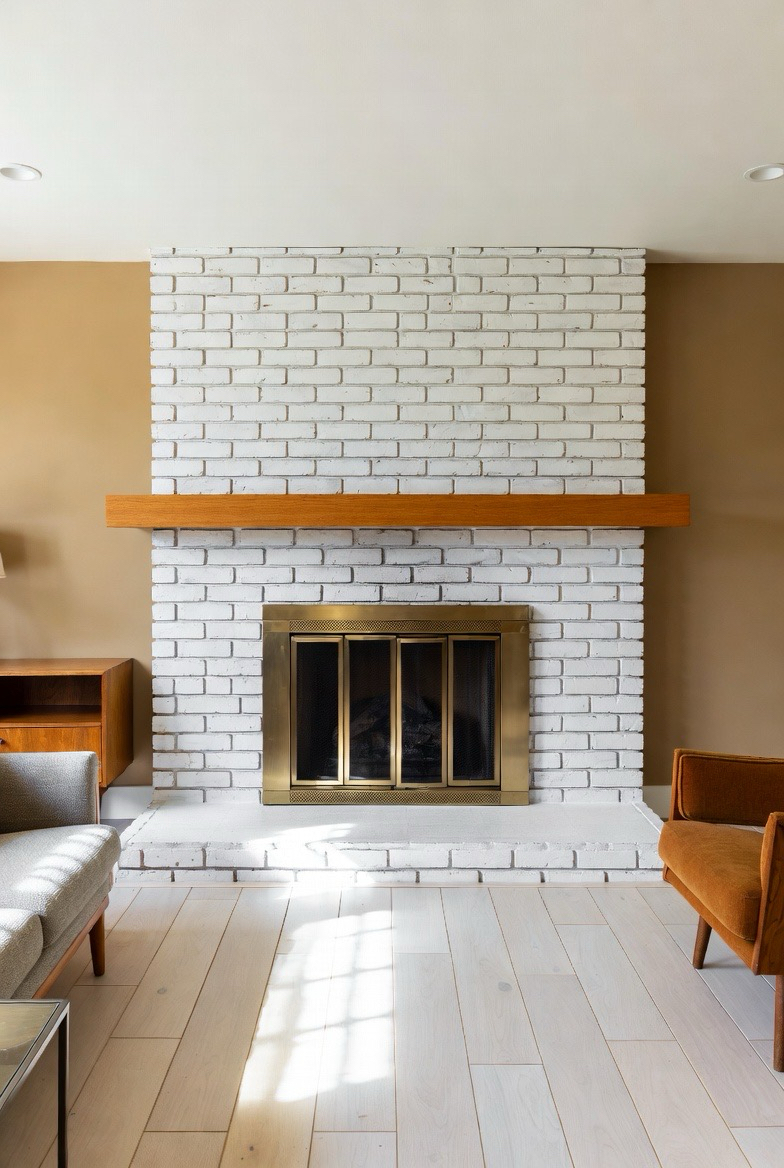 Whitewashing your brick fireplace lets the texture shine through while brightening the overall design. This soft, airy finish pairs beautifully with wood accents and modern décor. The slightly rustic feel stays authentic to mid-century style while providing a clean contemporary update. This makeover is perfect for cozy family rooms and open living spaces alike.