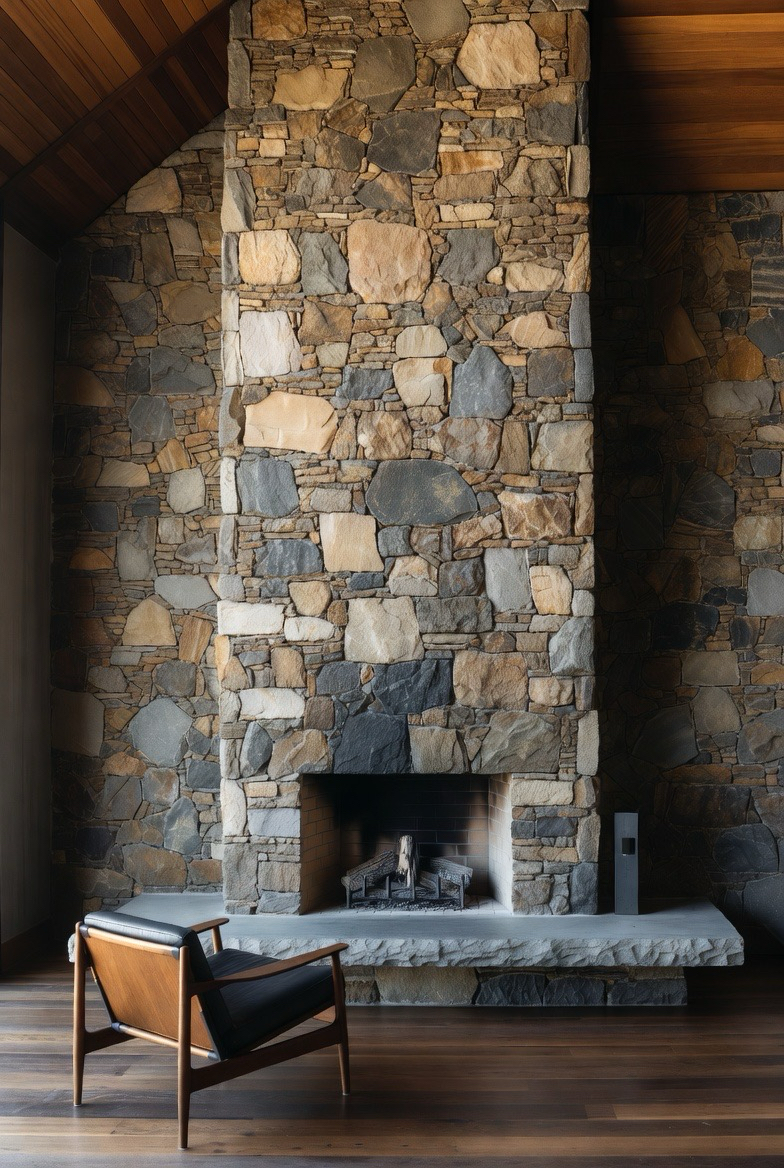 A floor-to-ceiling stone fireplace delivers iconic mid-century drama while keeping the space grounded and warm. Choose natural stone in muted earthy tones to capture that authentic retro feel. The tall vertical design elongates the room, making ceilings appear higher and the space more open. Pair with a streamlined hearth and minimal décor for a polished look. This transformation brings bold texture and organic charm, offering a stunning focal point that enhances both traditional and modern homes.