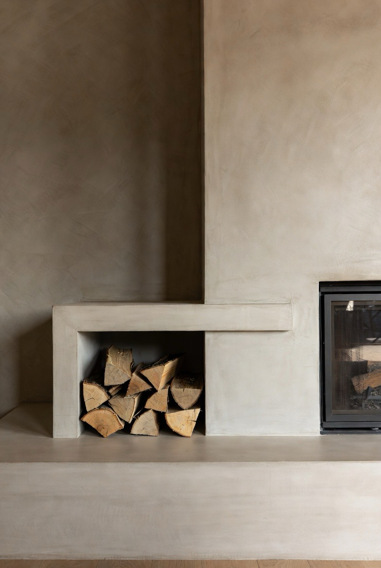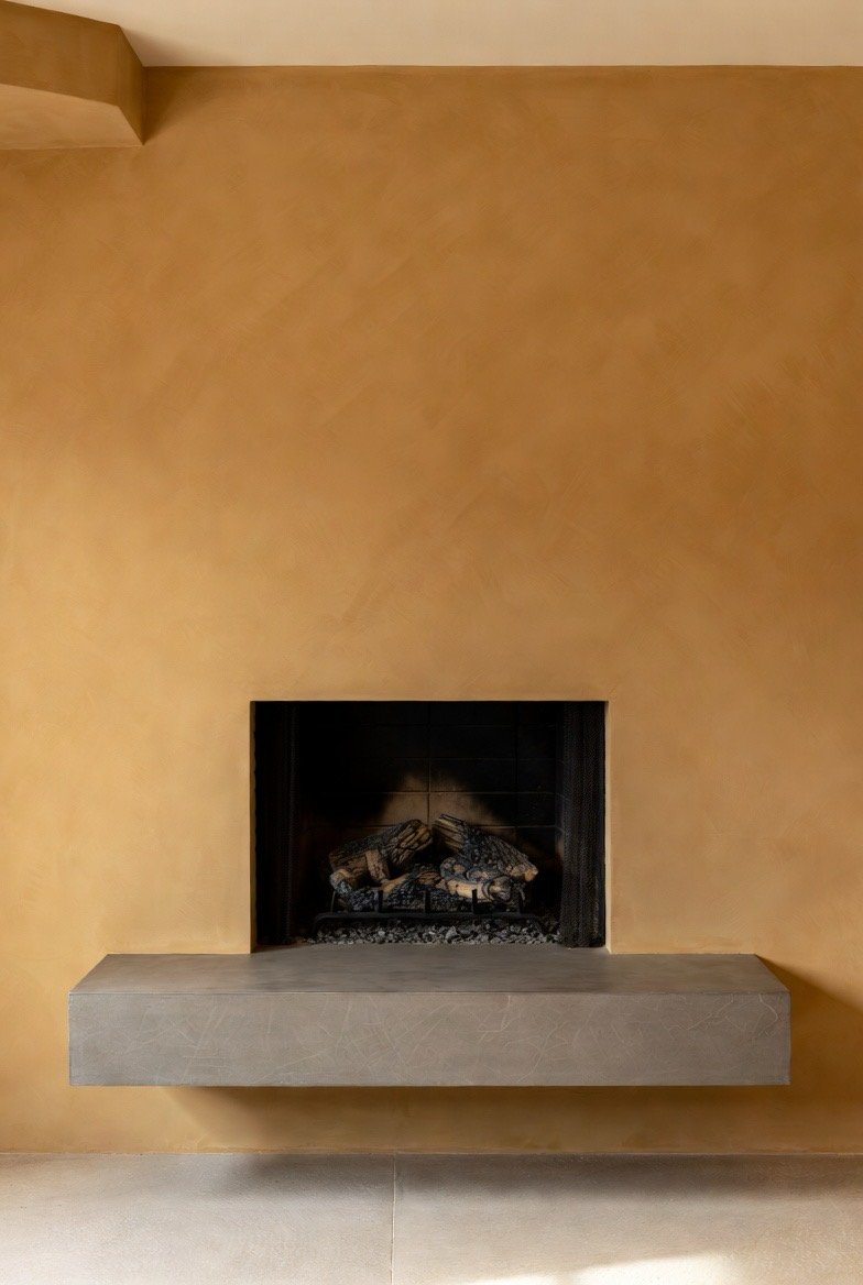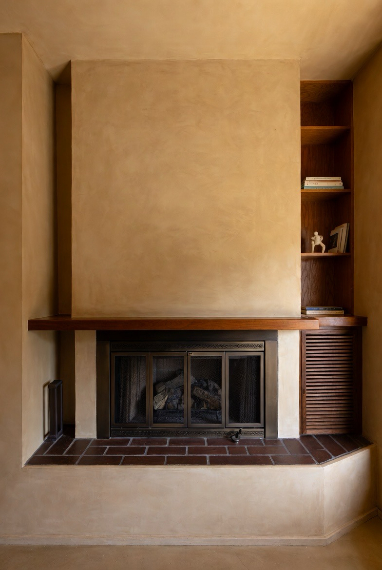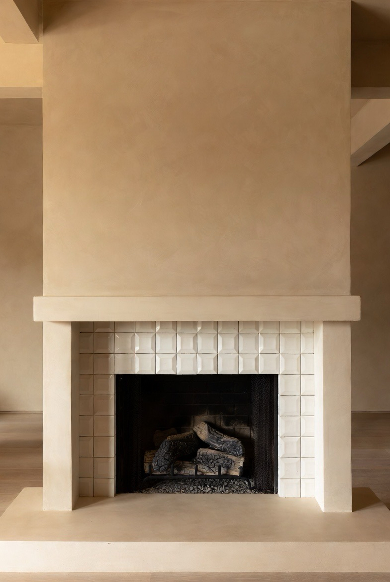 40.) Soft Beige Plaster Fireplace with Built-In Ledge