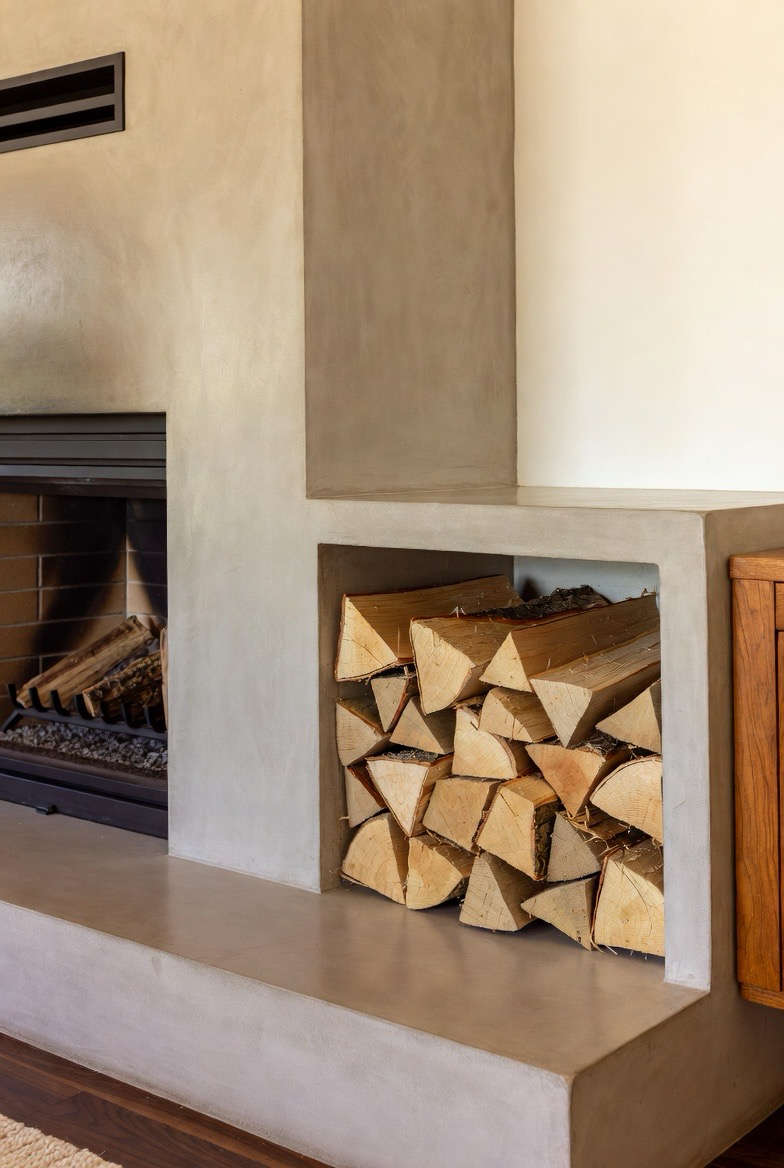 Incorporate built-in wood storage next to your fireplace to create a practical and visually appealing mid-century upgrade. The stacked logs add texture and earthy charm, complementing clean lines and simple shapes. Pair the storage nook with a neutral fireplace surround like stone or concrete. This functional yet stylish transformation blends practicality with retro charm, making it a perfect addition to both modern and rustic living spaces.