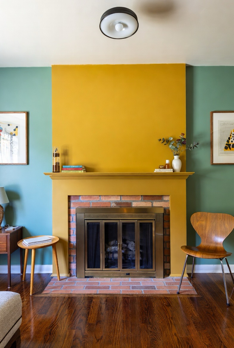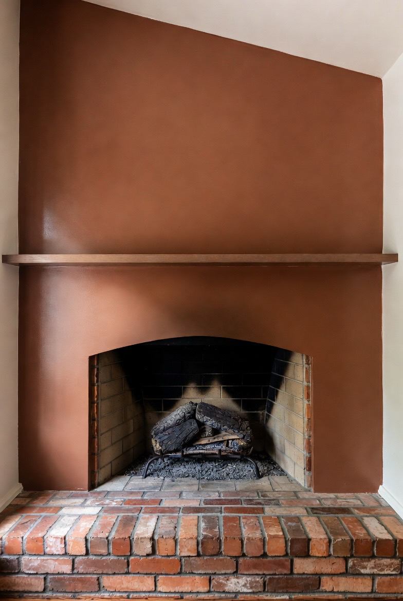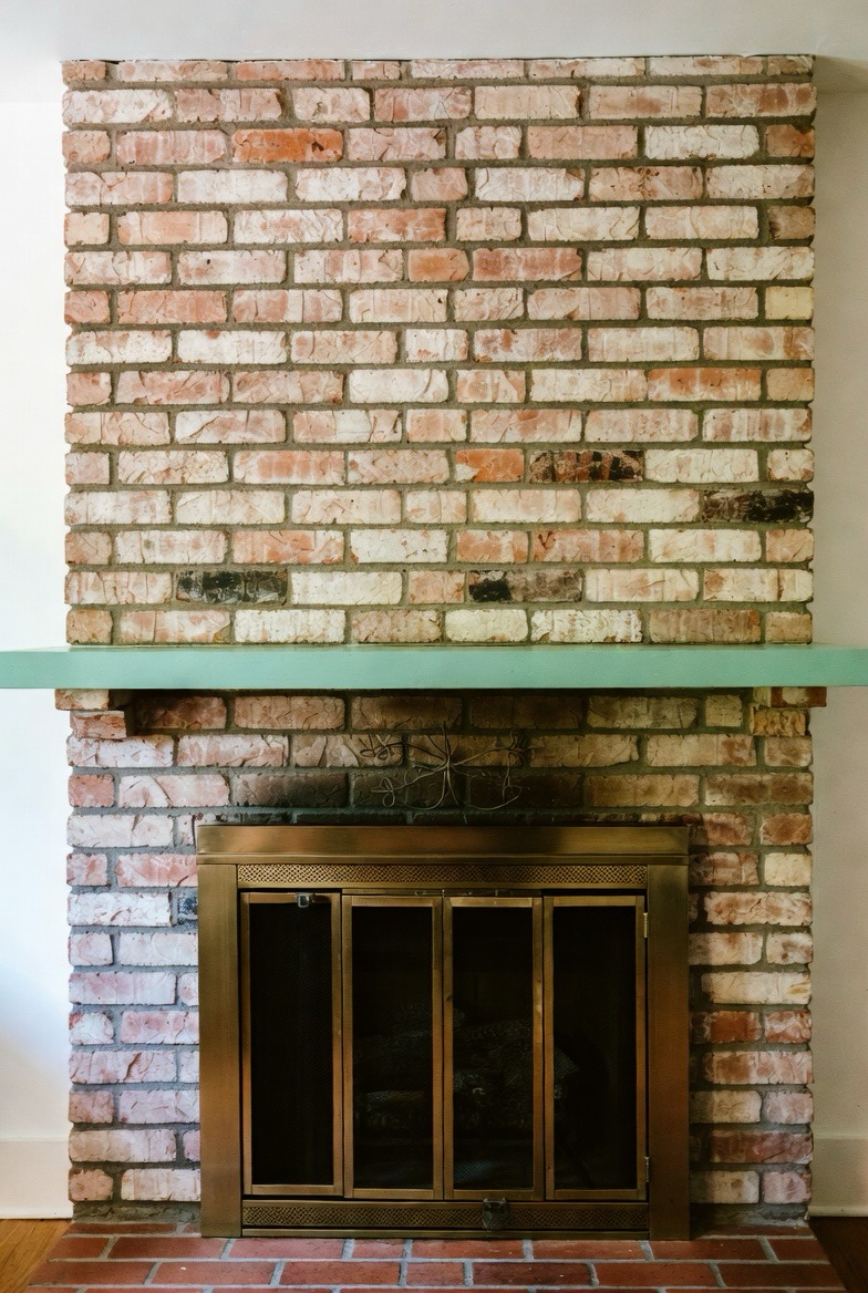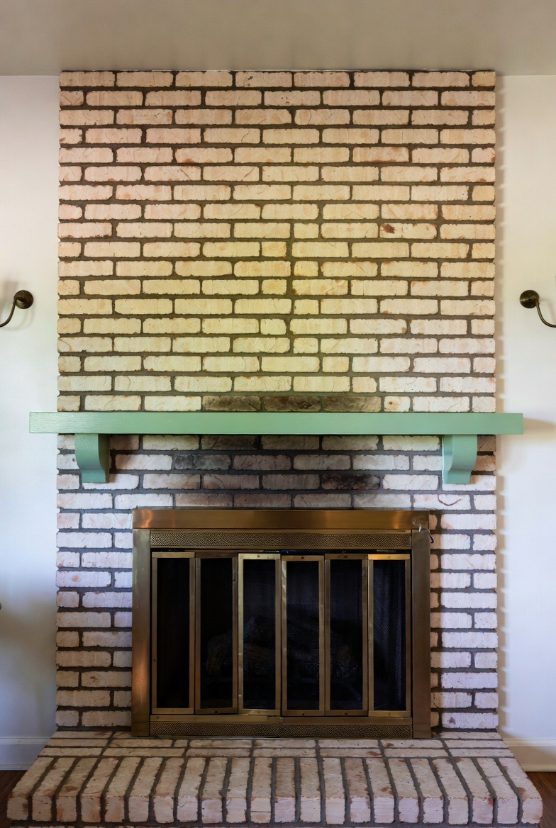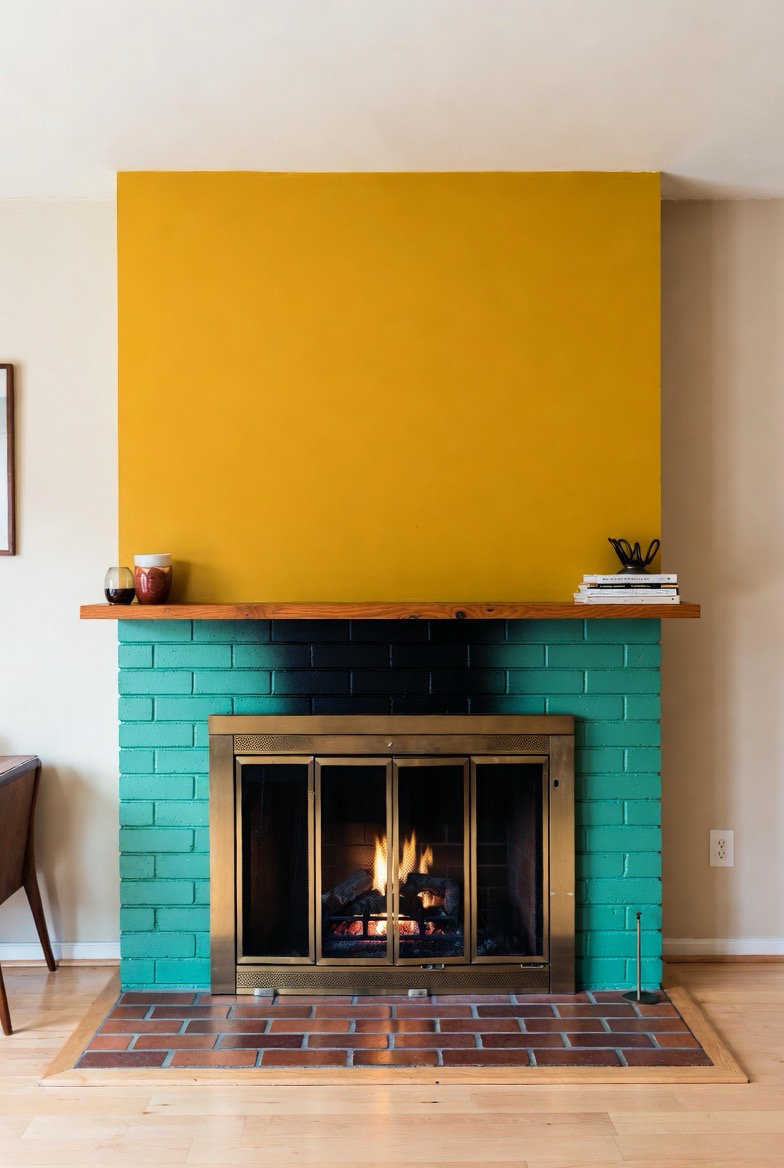 Keep the brick natural or whitewashed, then add a painted mantel in a bold retro hue like mint, mustard, or teal. The pop of color adds personality without overwhelming the space. This makeover is perfect for playful mid-century-inspired homes that embrace color and charm.