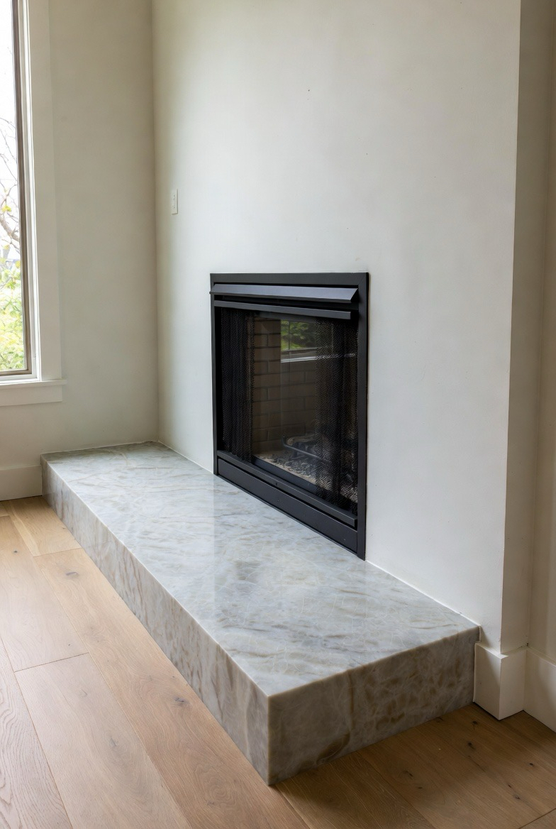 A raised hearth gives your fireplace a sculptural presence, perfect for mid-century-inspired homes. Choose a smooth stone surface like marble or quartz for a polished finish. The elevated platform adds dimension and functionality, providing extra seating or display space. This makeover creates a cozy yet sophisticated focal point that works well in both open-concept and smaller living rooms, adding structure and visual interest effortlessly.