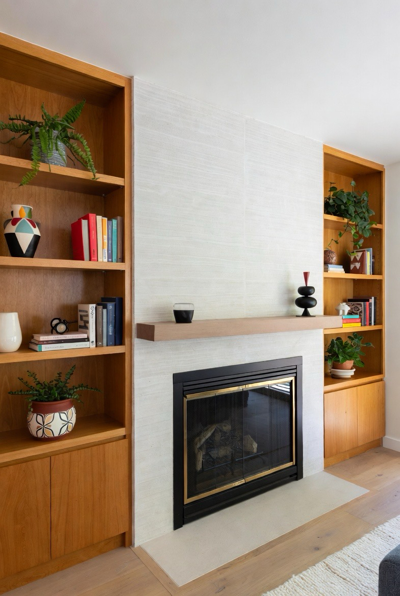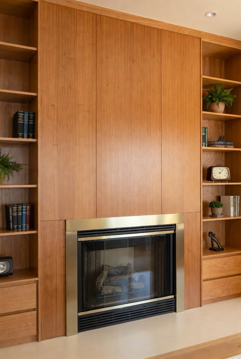 Frame your fireplace with custom built-in shelves in warm wood tones to achieve a true mid-century vibe. The symmetrical layout enhances balance, while the wood adds warmth and charm. Display books, plants, or retro décor pieces to elevate the style. This transformation creates a functional and stylish feature wall that mixes storage with aesthetic appeal. It’s one of the most timeless ways to enhance your fireplace.