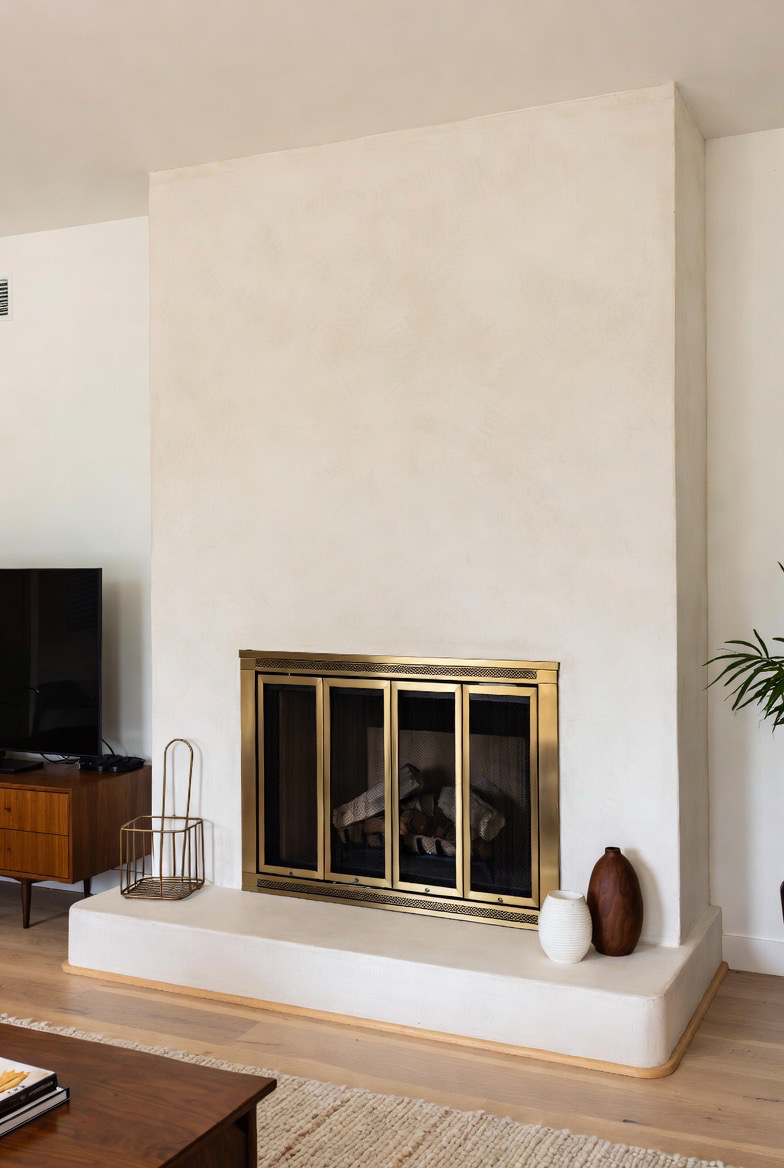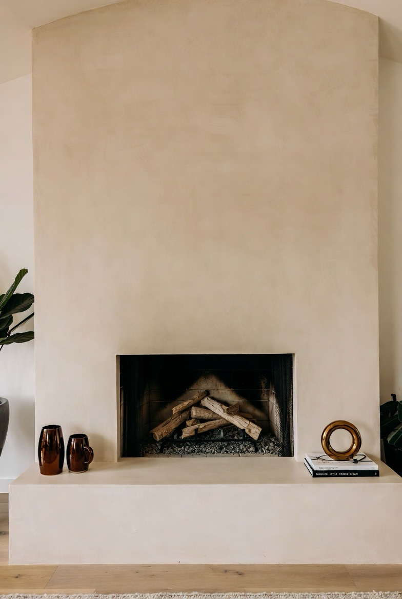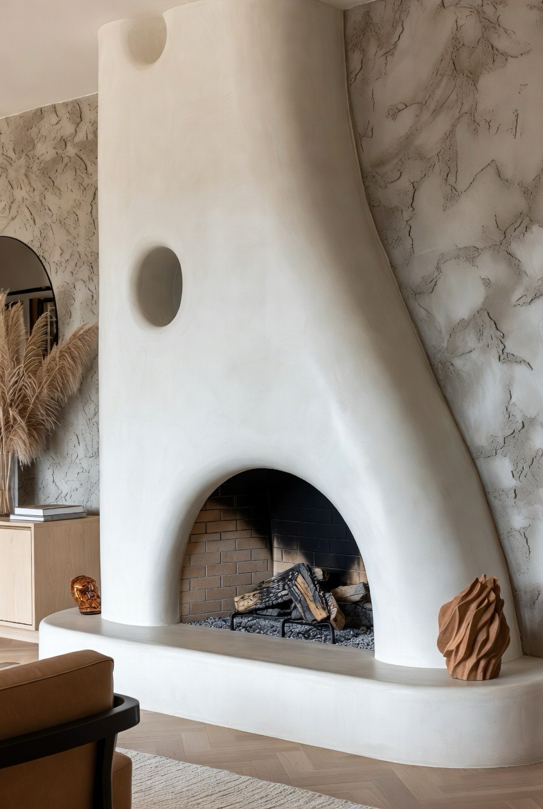 A stucco fireplace with rounded corners adds a soft, sculptural mid-century look that feels warm and inviting. Keep the color neutral to highlight the shape. This design blends beautifully with minimalist or organic modern interiors, turning the fireplace into a timeless architectural feature.