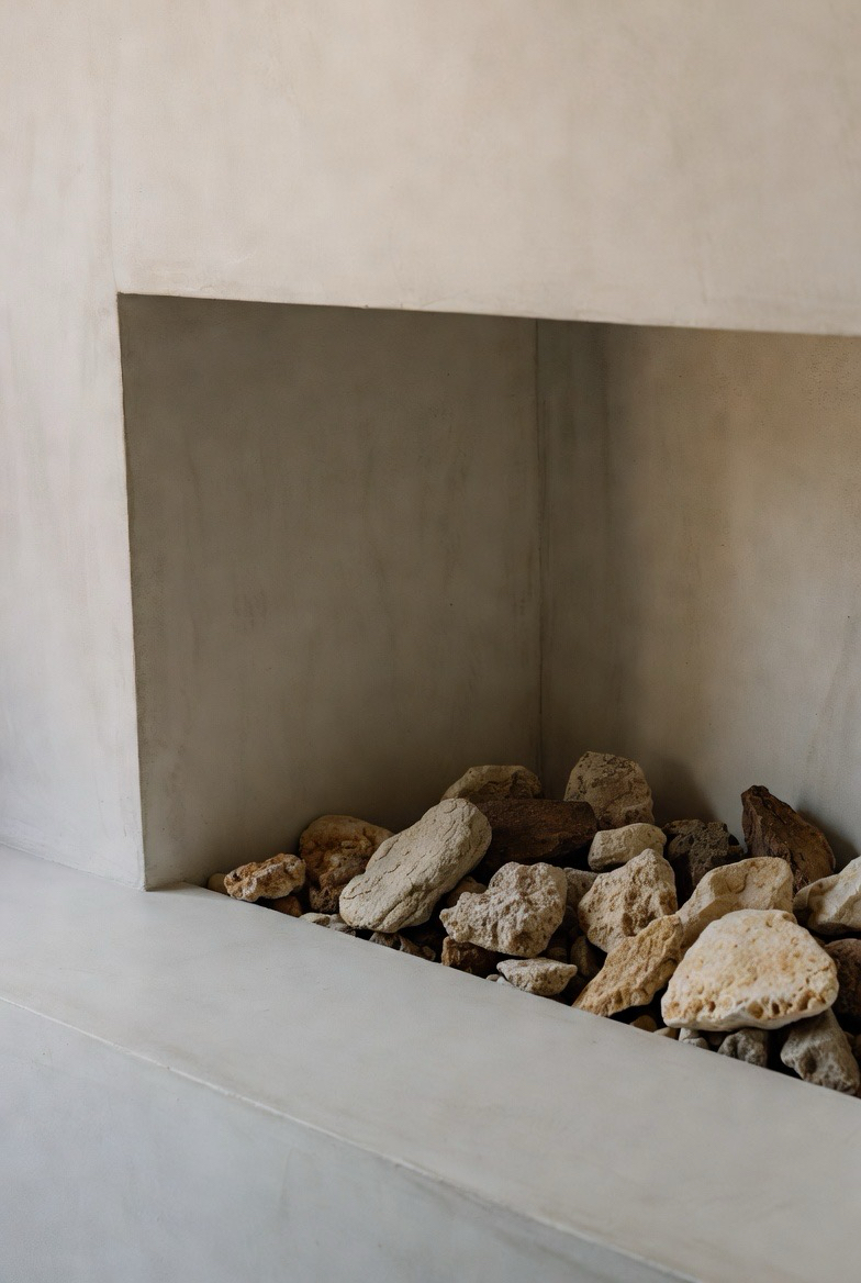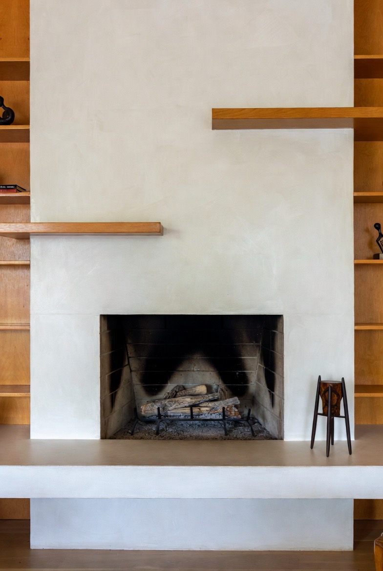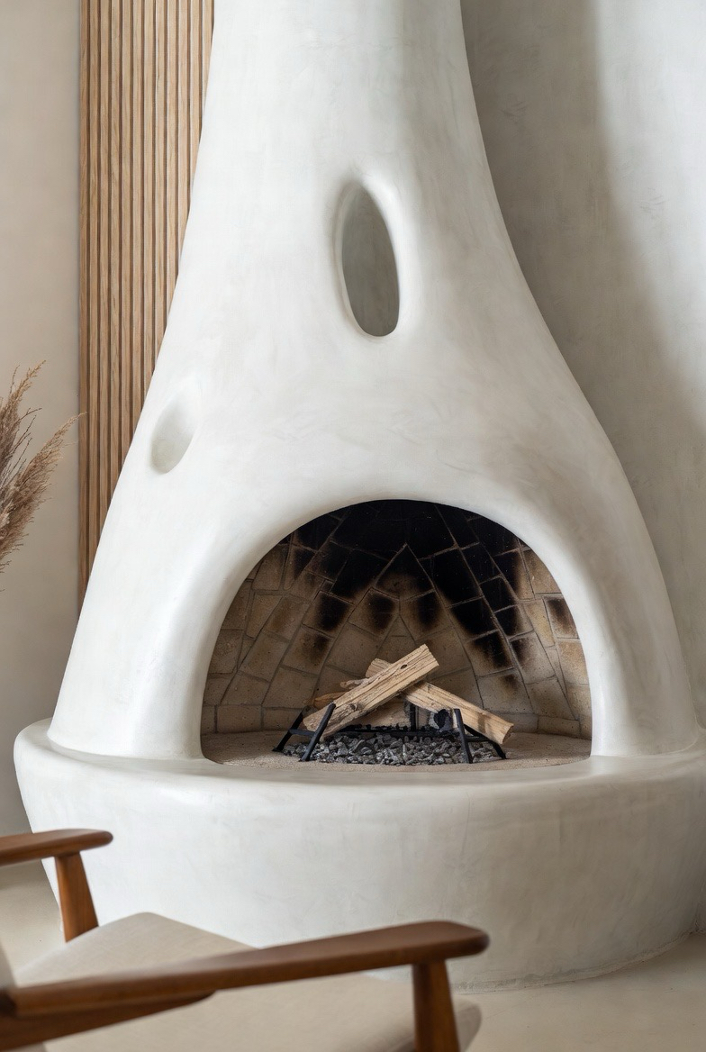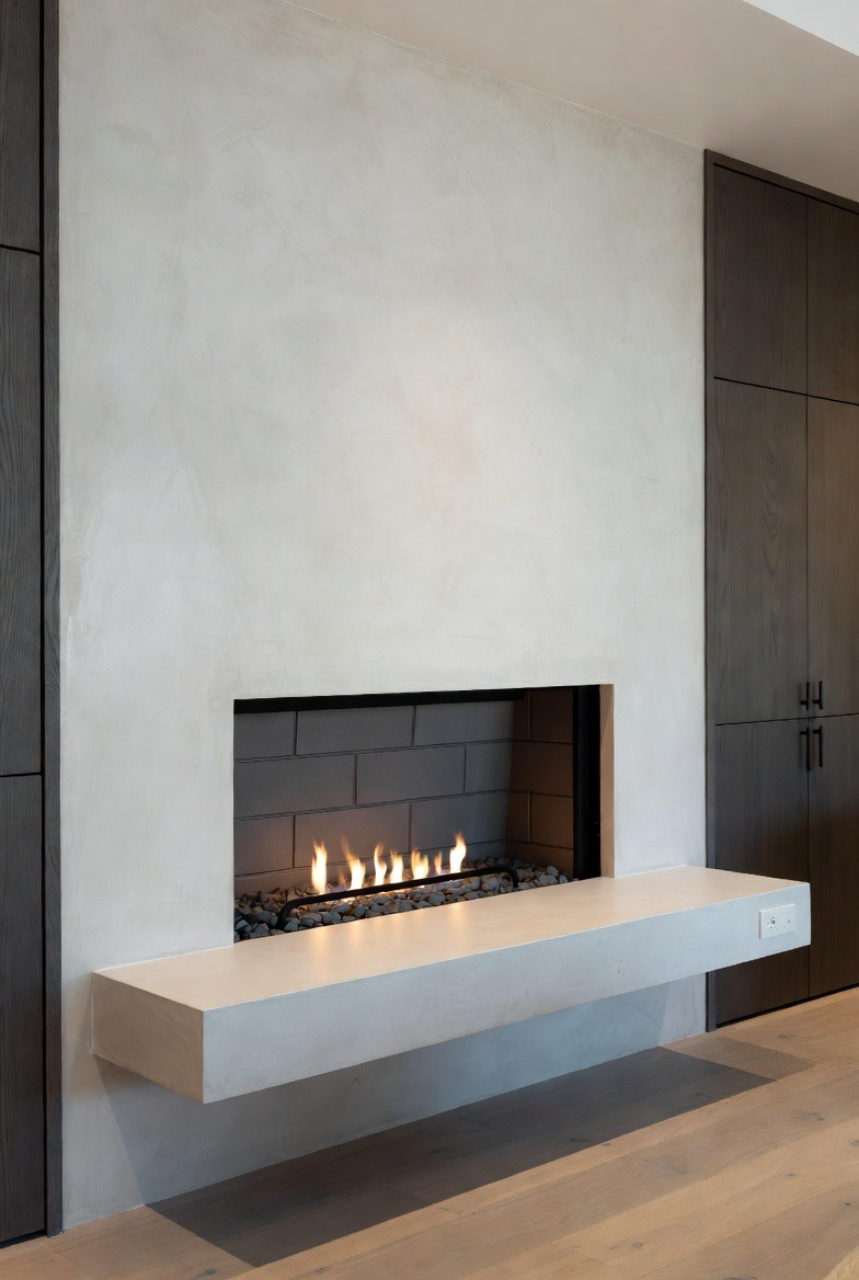 A stucco fireplace with rounded corners adds a soft, sculptural mid-century look that feels warm and inviting. Keep the color neutral to highlight the shape. This design blends beautifully with minimalist or organic modern interiors, turning the fireplace into a timeless architectural feature.