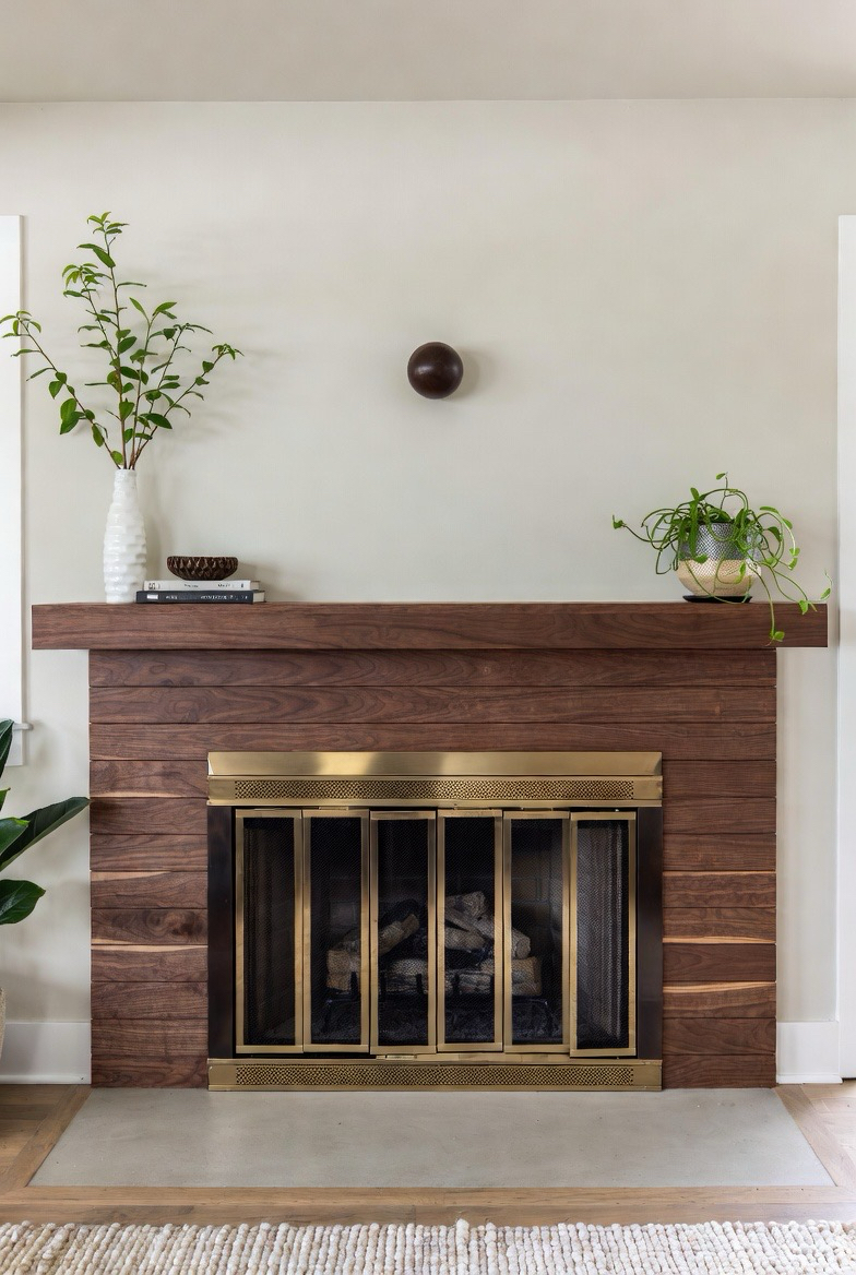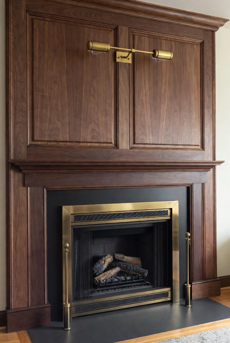 Install dark wood paneling around your fireplace to create a classic mid-century mood. Walnut or mahogany tones work beautifully with a slim fireplace insert for a clean, modern finish. Add brass accents or sconce lighting to elevate the look further. This transformation blends elegance, warmth, and vintage charm seamlessly.