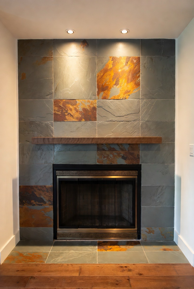 18.) Slate Tile Fireplace with Minimal Mantel