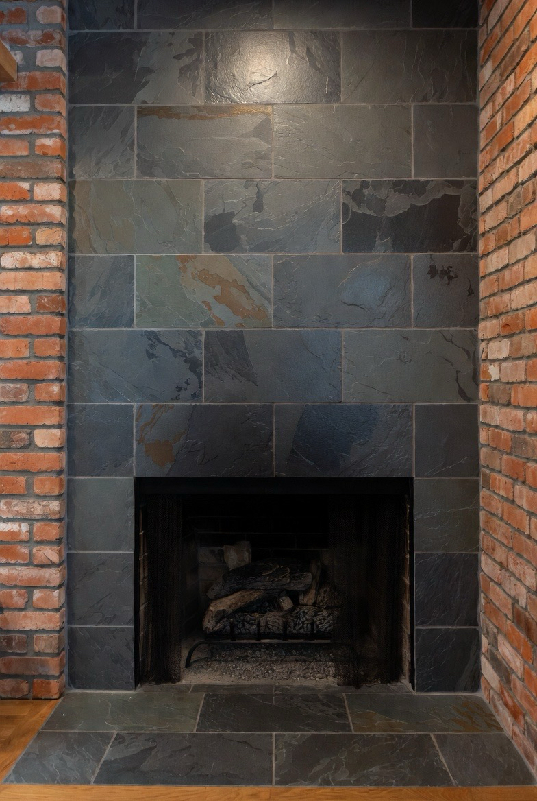 Choose slate tile for a rich, earthy mid-century texture that adds depth and sophistication. The natural variation of slate elevates the fireplace while keeping the look grounded. Pair with a slim wooden mantel or skip it entirely for a more minimal aesthetic. This makeover blends warmth, durability, and modern charm seamlessly.
