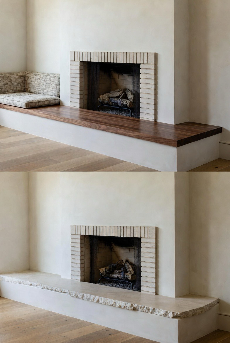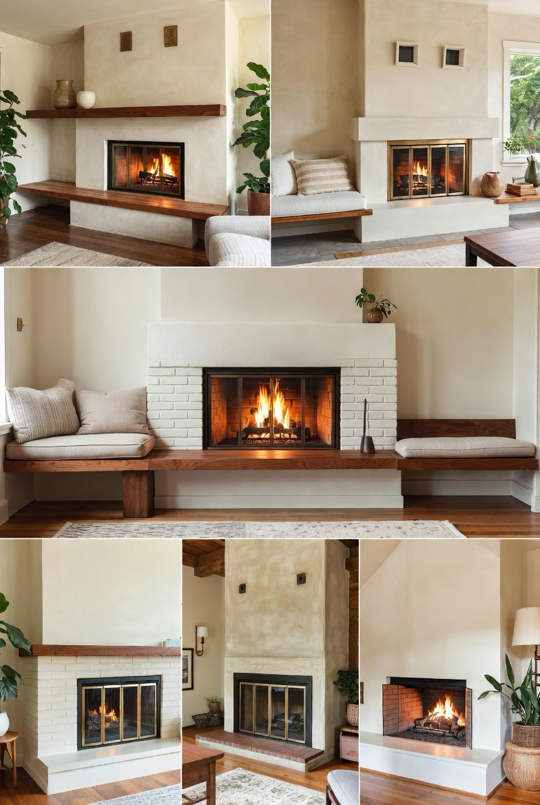 Add comfort and utility by extending your hearth into a built-in bench. Upholster the seat for added softness or leave it as wood or stone for a minimalist feel. This transformation adds architectural interest and extra seating, perfect for conversation areas. Pair with light brick or painted finishes for a cozy and modern mid-century vibe.