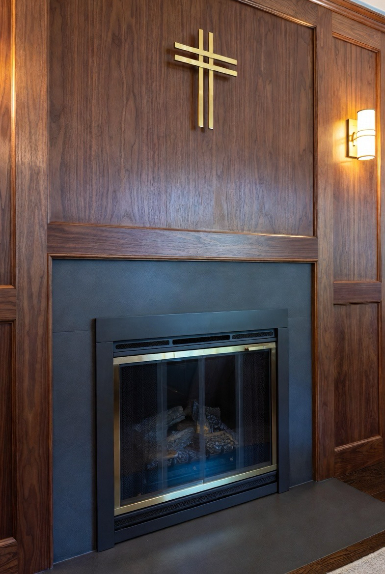 26.) Dark Wood Paneling with Slim Fireplace Insert