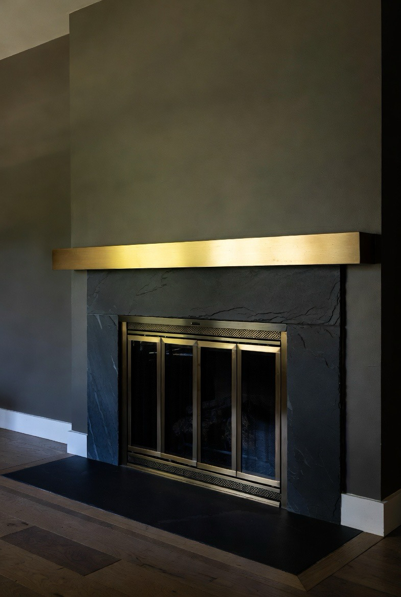 27.) Black Slate Fireplace with Gold Accents