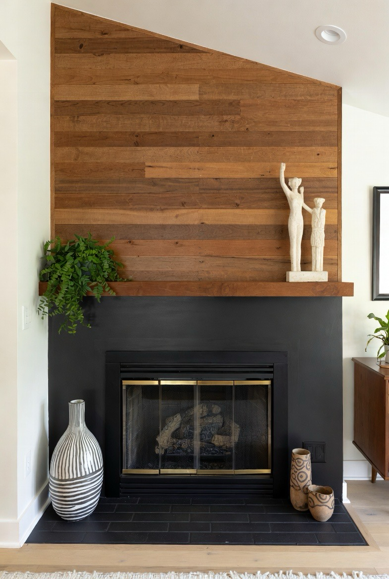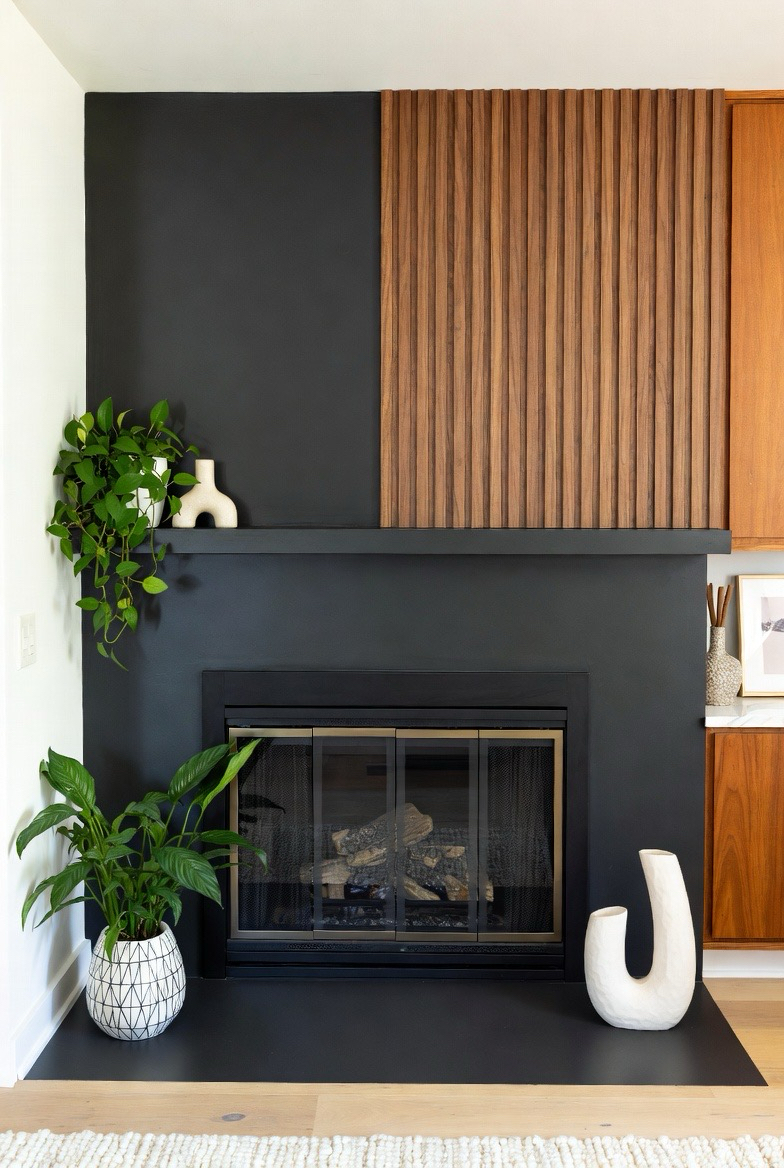 Paint your fireplace black for dramatic contrast and pair it with a warm wood accent wall or panel. The mix of dark and light elements captures a true mid-century feel. Add greenery and sculptural décor to soften the look. This transformation creates depth and sophistication in any living space.