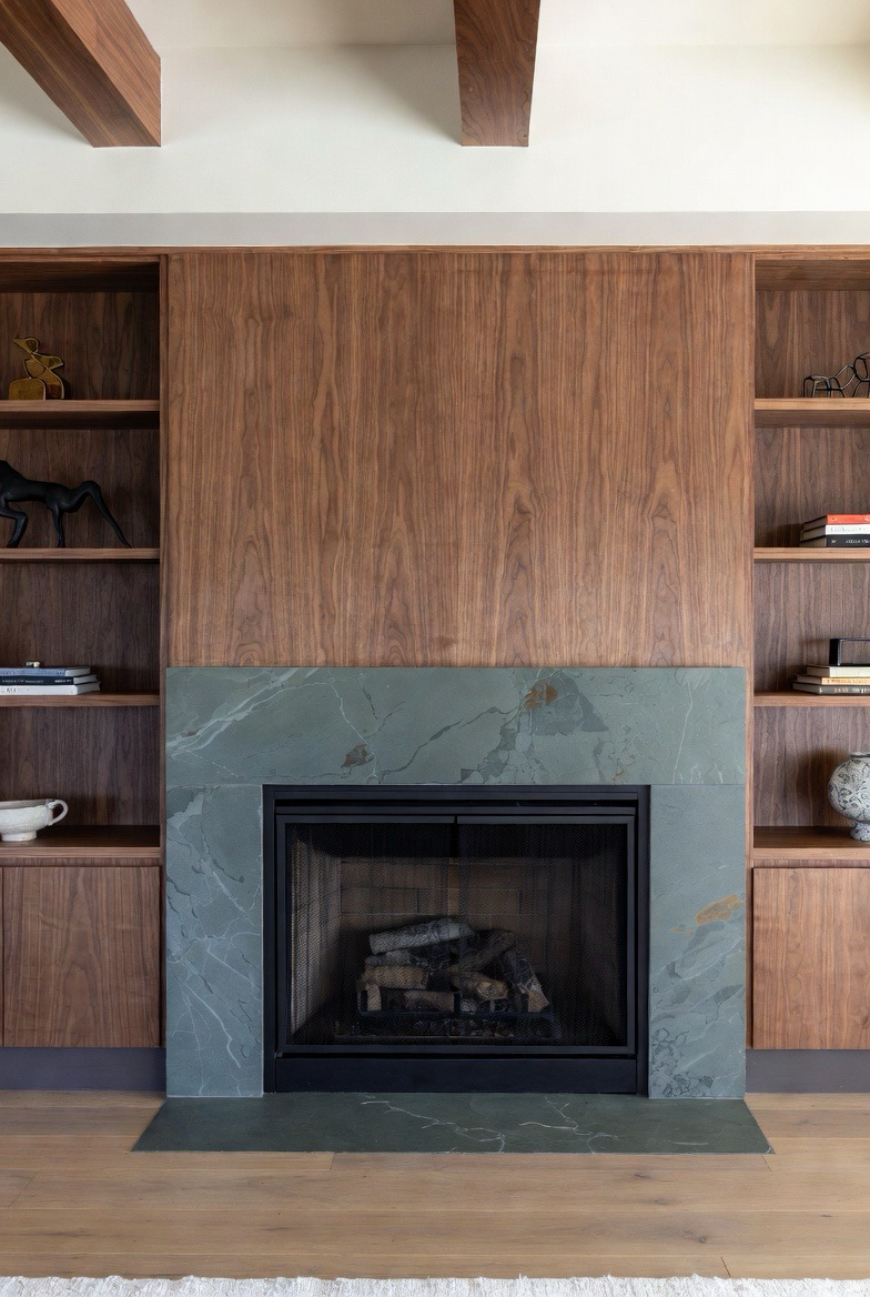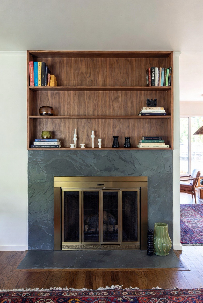Combine the cool texture of slate with the warm beauty of walnut shelving to create a balanced, stylish design. The earthy tones complement one another perfectly, enhancing the mid-century mood. This upgrade adds storage, character, and visual interest while feeling fresh and timeless.