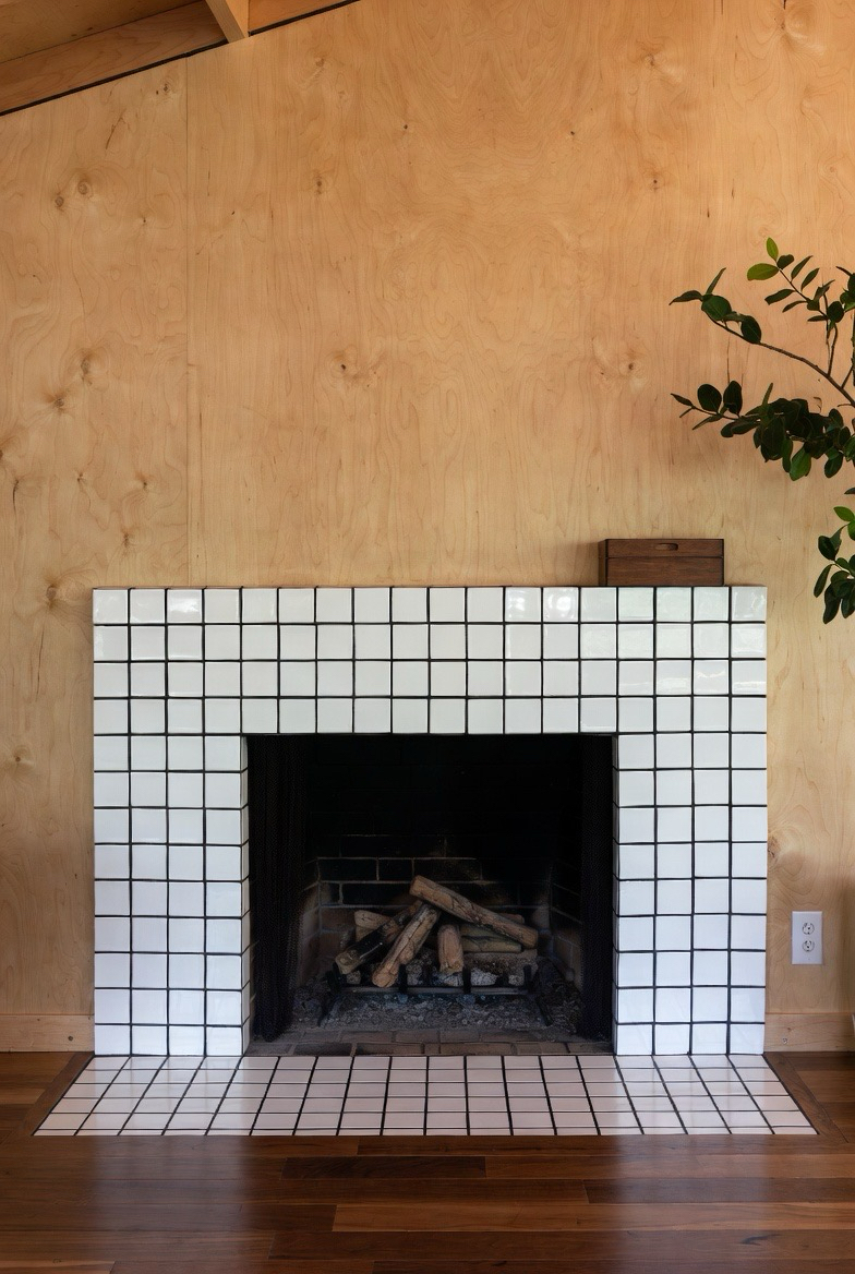 35.) White Tile Fireplace with Black Grout