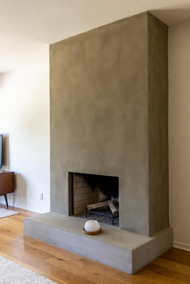 A smooth concrete fireplace surround instantly introduces modern edge while staying true to mid-century design principles. The cool gray tones pair beautifully with warm wood accents like a walnut mantel or built-in shelving. Add sleek metal elements for a refined contrast. This makeover creates a seamless minimalistic look perfect for open-concept homes. The concrete texture adds subtle sophistication, transforming the fireplace into a striking architectural feature that’s both trendy and timeless.
