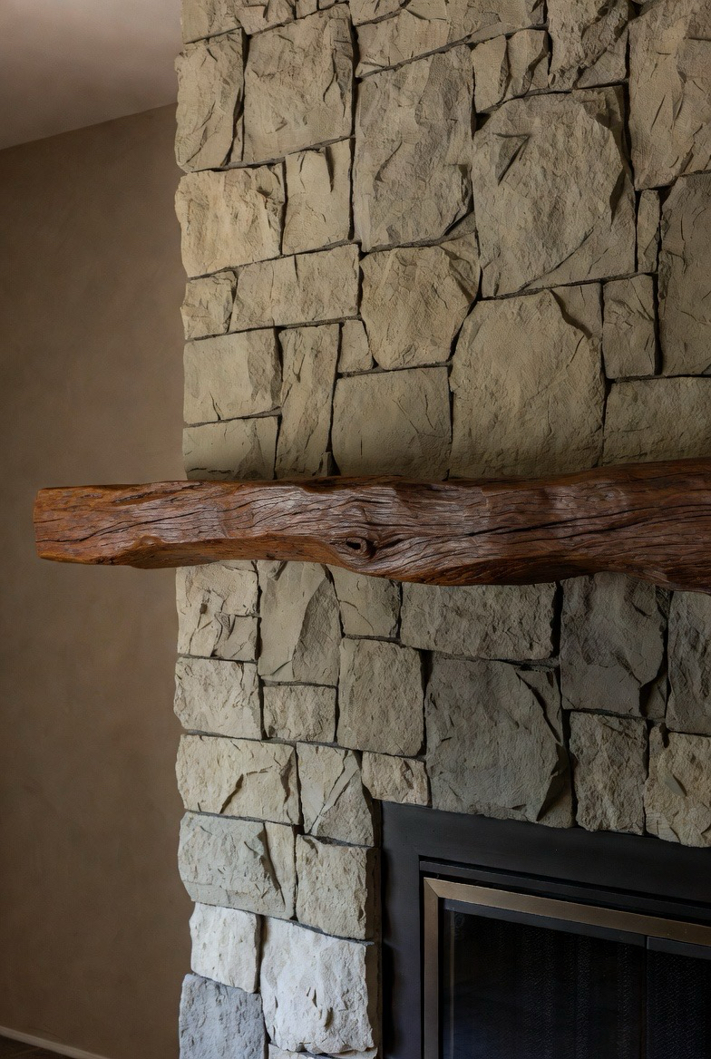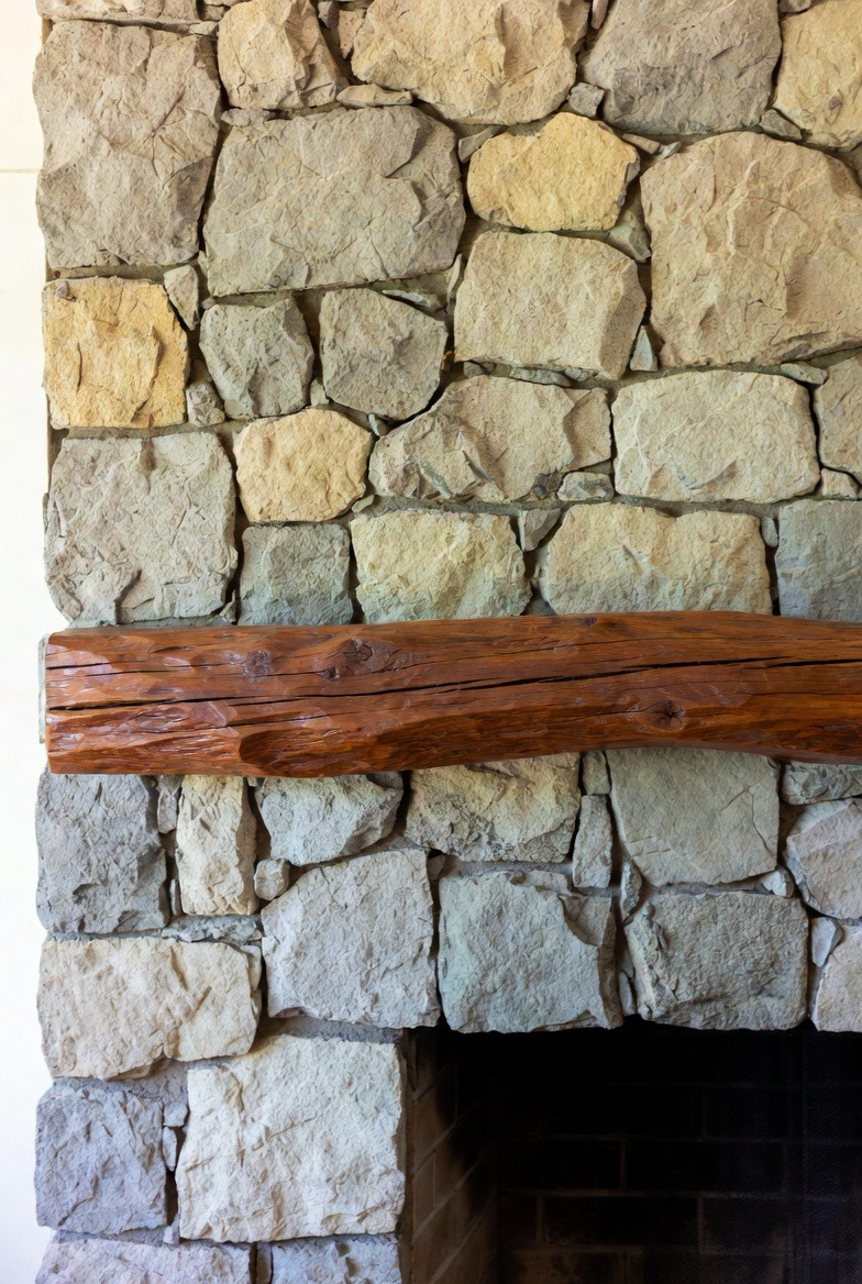 37.) Textured Stone Fireplace with Wooden Beam Mantel