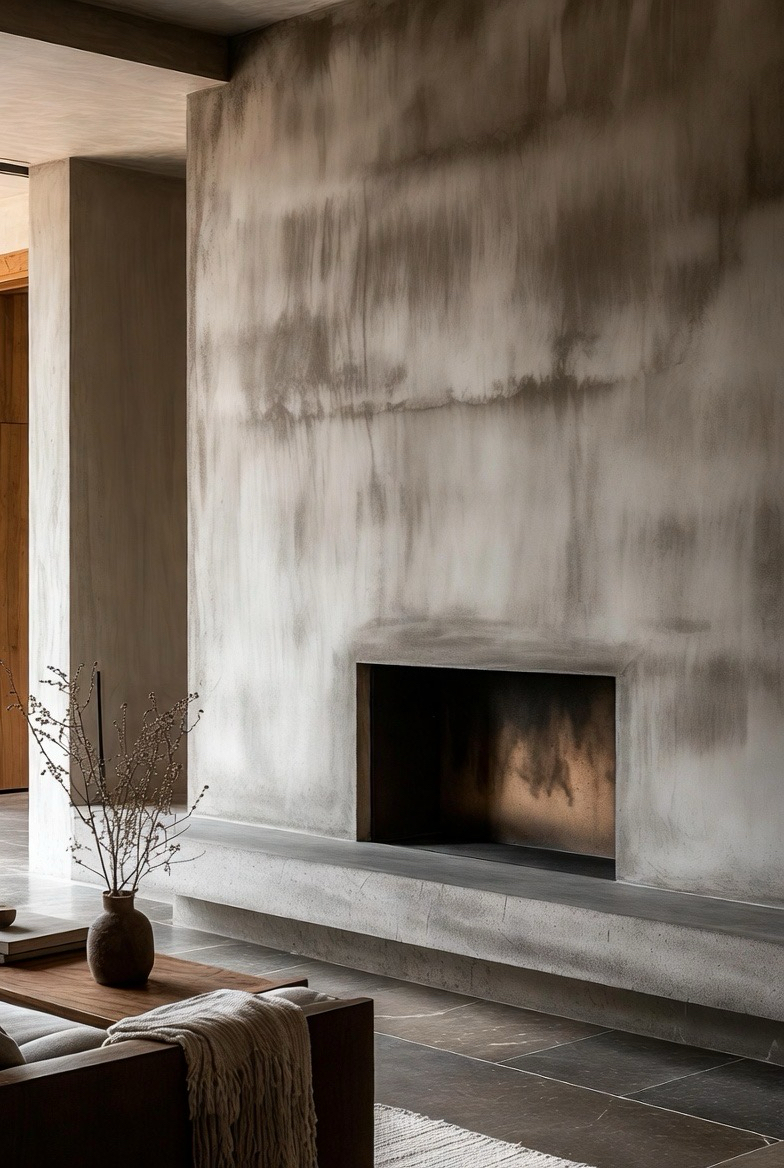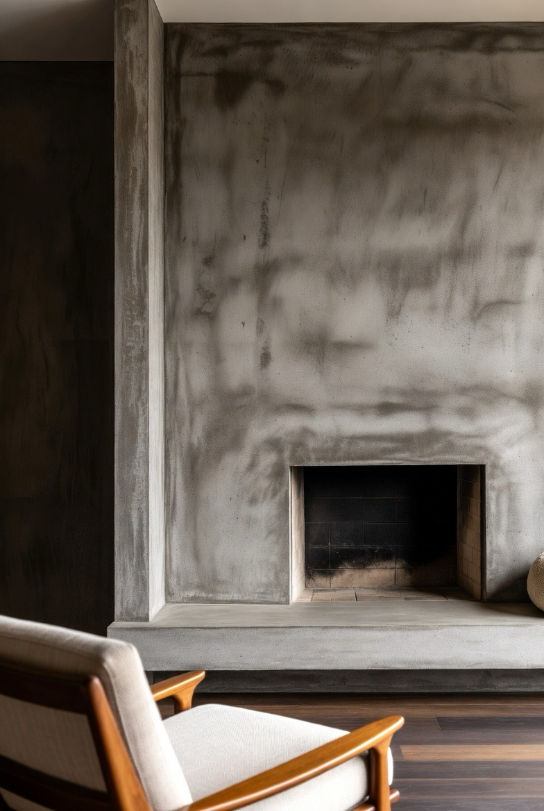 For a dramatic modern statement, create a full concrete wall with an inset fireplace. The smooth, industrial-inspired texture fits mid-century designs perfectly. Keep décor minimal and add warm accents like wood furniture or soft textiles. This transformation is bold, elegant, and timeless.