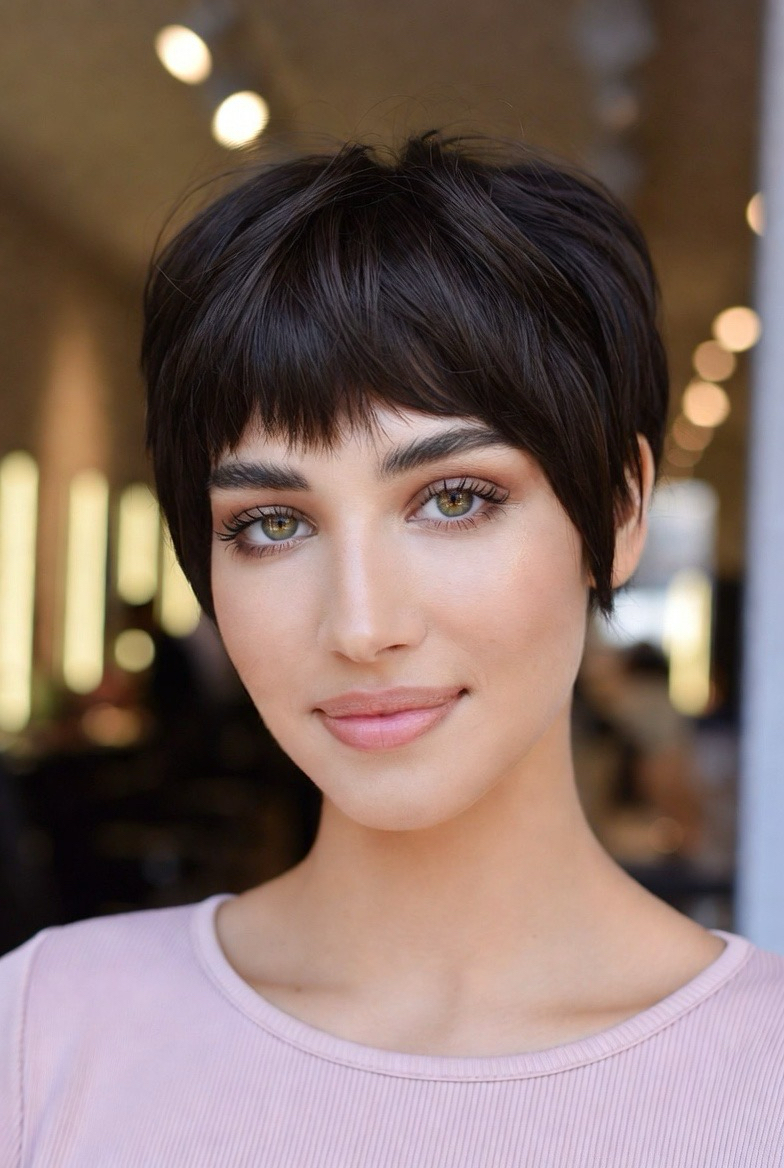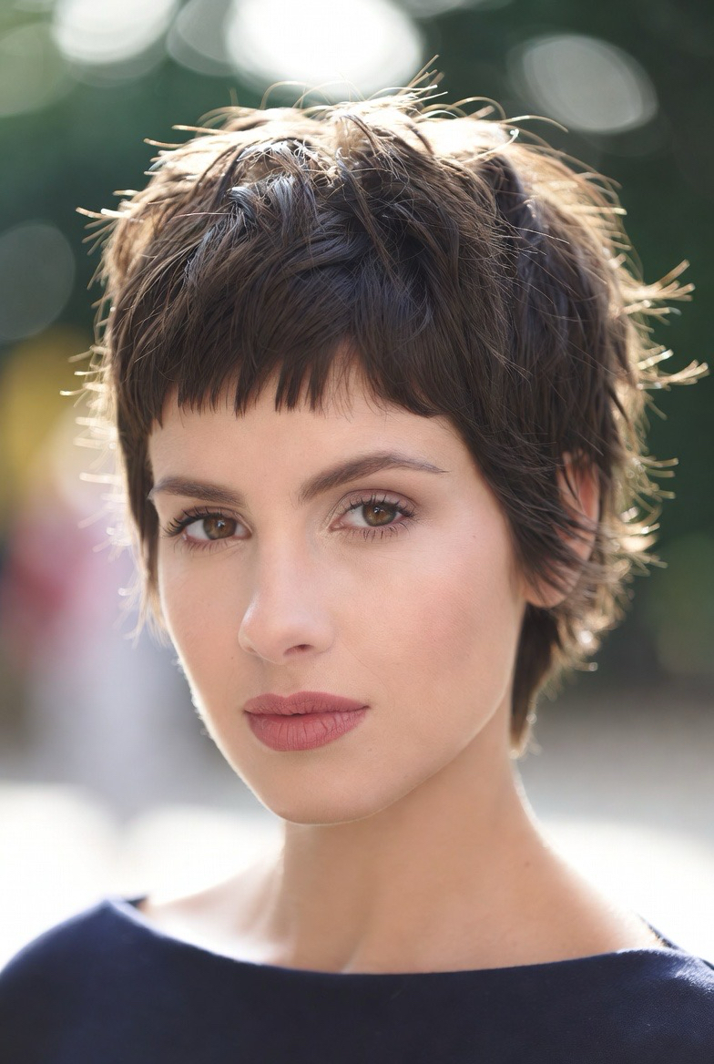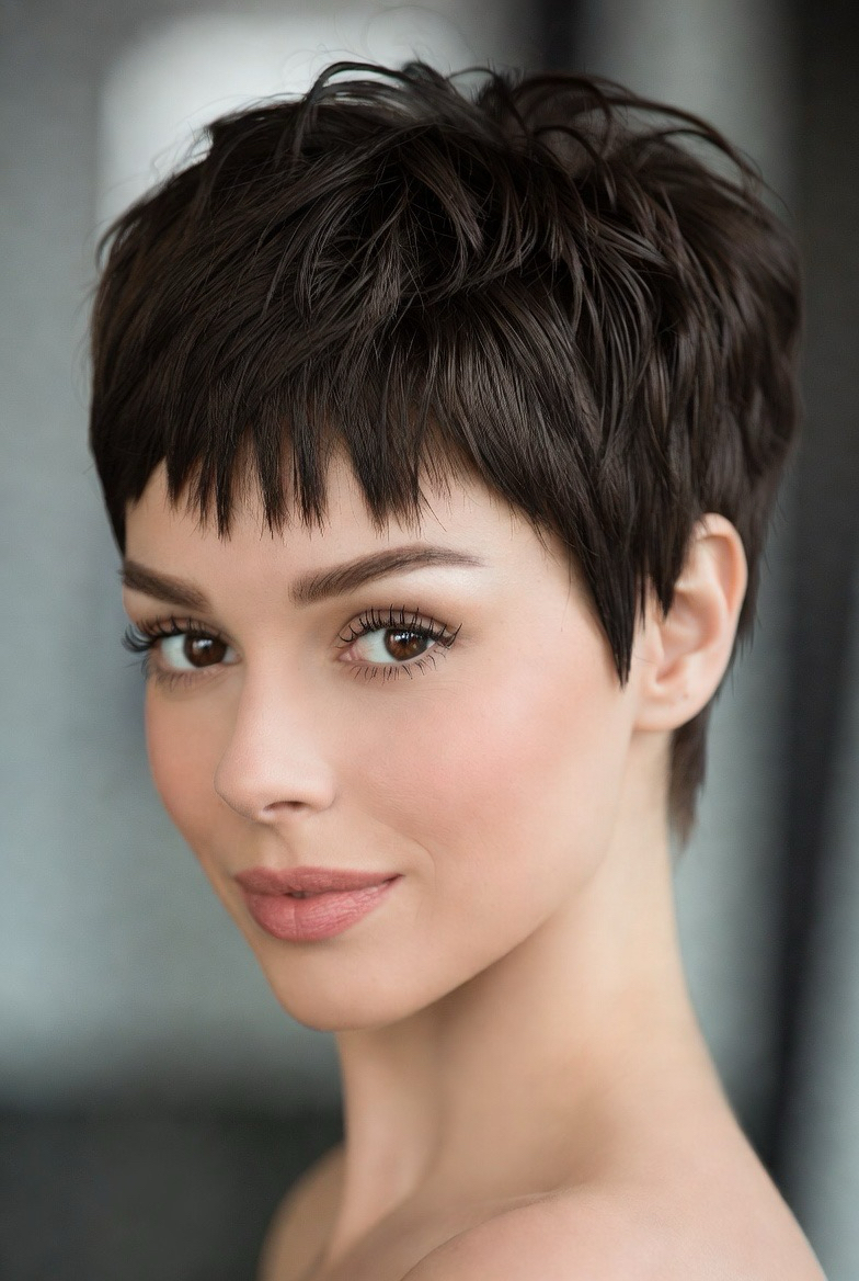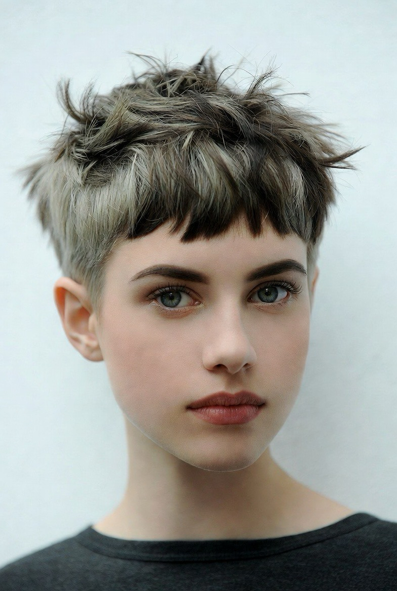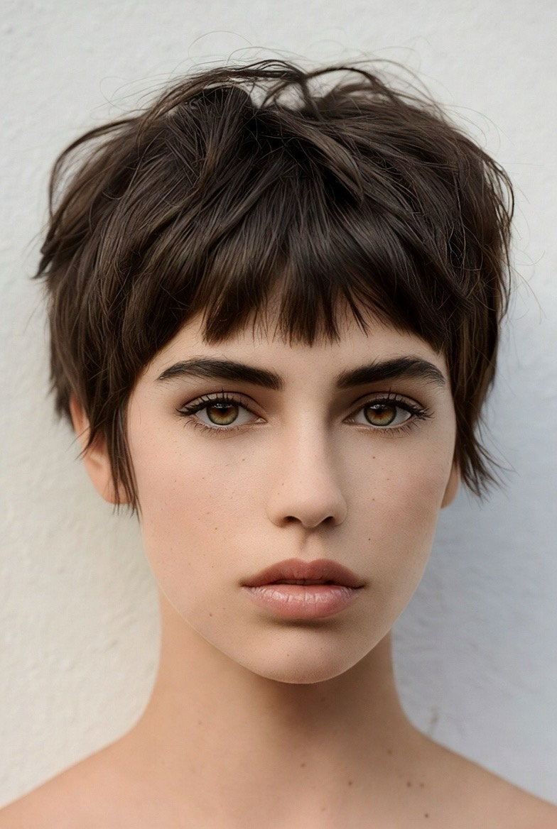 Pixie cuts paired with choppy bangs feel youthful and fresh. The bangs soften facial features while keeping the look playful and modern.