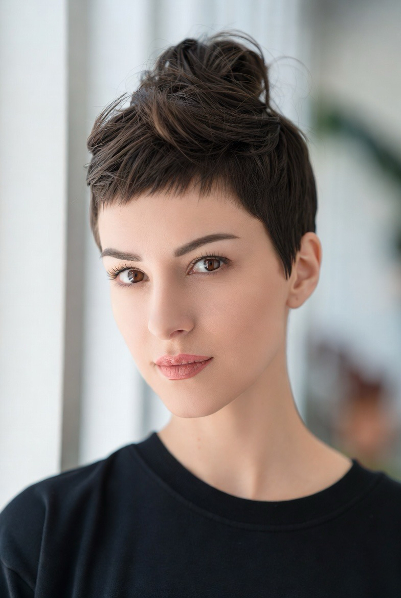 Adding volume at the crown elongates the face, making this style perfect for round face shapes. The lifted top balances facial proportions while the cropped sides keep the look neat. This haircut works beautifully for women who want a slimming effect without sacrificing style.