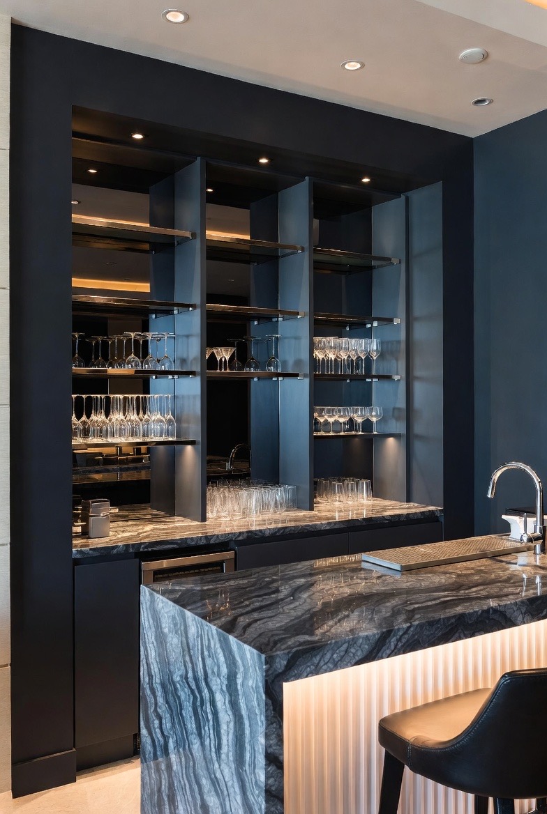 Move away from the rolling cart and toward a built-in bar with a stone countertop. Using materials like soapstone or dark marble creates a tactile, luxurious surface for mixing drinks. Add a small sink, a dedicated ice maker, and open shelving for your glassware. By keeping the color palette dark, think charcoal or navy cabinetry, the bar becomes a sleek focal point that feels more like a high-end hotel lounge than a basement corner.