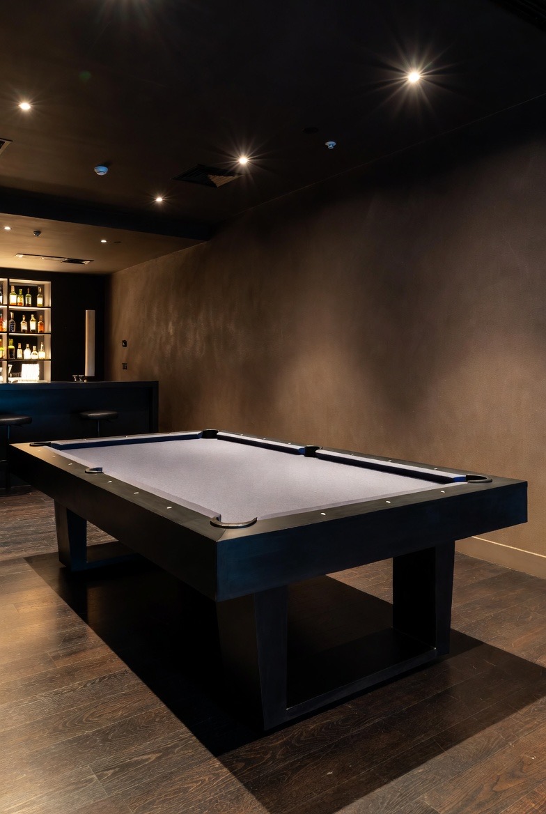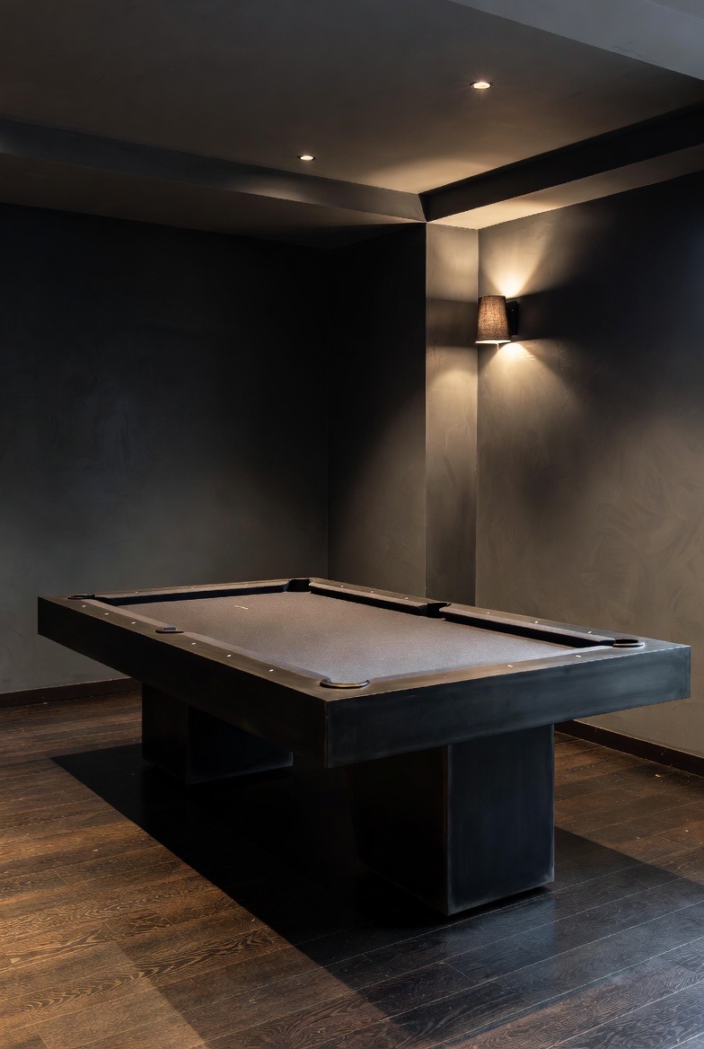 If you have the space for a pool table, skip the felt-green and oak-veneer versions. Look for a table with a minimalist frame in black steel or dark wood, paired with slate-grey or navy blue felt. It turns a piece of gaming equipment into a sculptural element of the room. It becomes a centerpiece that encourages social interaction without sacrificing the sophisticated aesthetic of the rest of your home.
