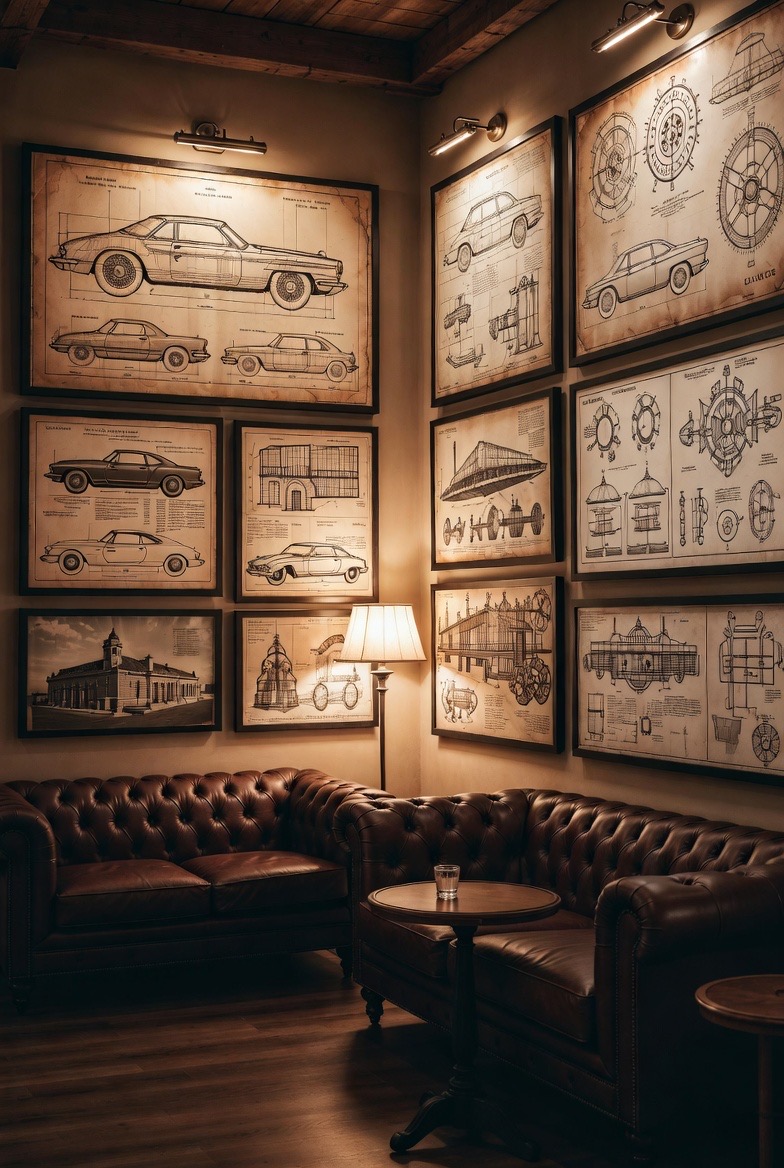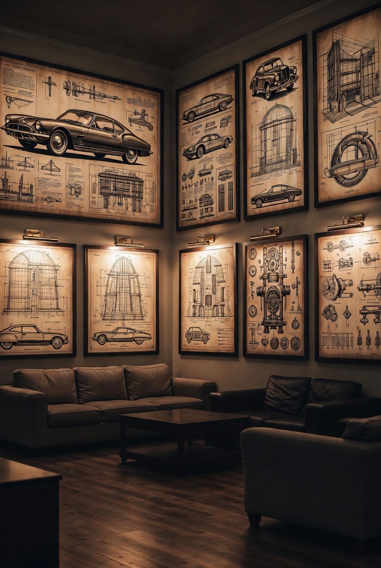 Instead of movie posters, consider framing large-scale vintage blueprints or technical schematics. Whether it is the design of a classic car, a local landmark, or a piece of machinery you admire, these prints add a layer of sophistication. They are visually interesting and act as a conversation starter, showing an appreciation for design and engineering without feeling cluttered.