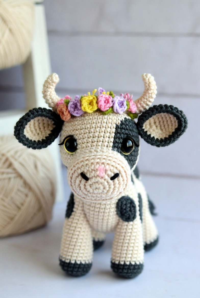 The cow is often seen as the backbone of the farm, and this amigurumi version adds a lovely, artistic touch to that tradition. To achieve a high-end look, you can use a quality cotton yarn in shades of cream and charcoal for the patches. What makes this heifer stand out is the addition of a delicate, hand-crocheted flower crown tucked behind one of her floppy ears. You can use tiny scraps of pink, yellow, and lavender yarn to create small blossoms that provide a vibrant pop of color against her neutral coat. This heifer is perfect for adding a bit of farmhouse flair to a kitchen shelf or as a soft, comforting companion for a child who dreams of the country life. Her friendly face and gentle stature make her a centerpiece of any handmade collection.