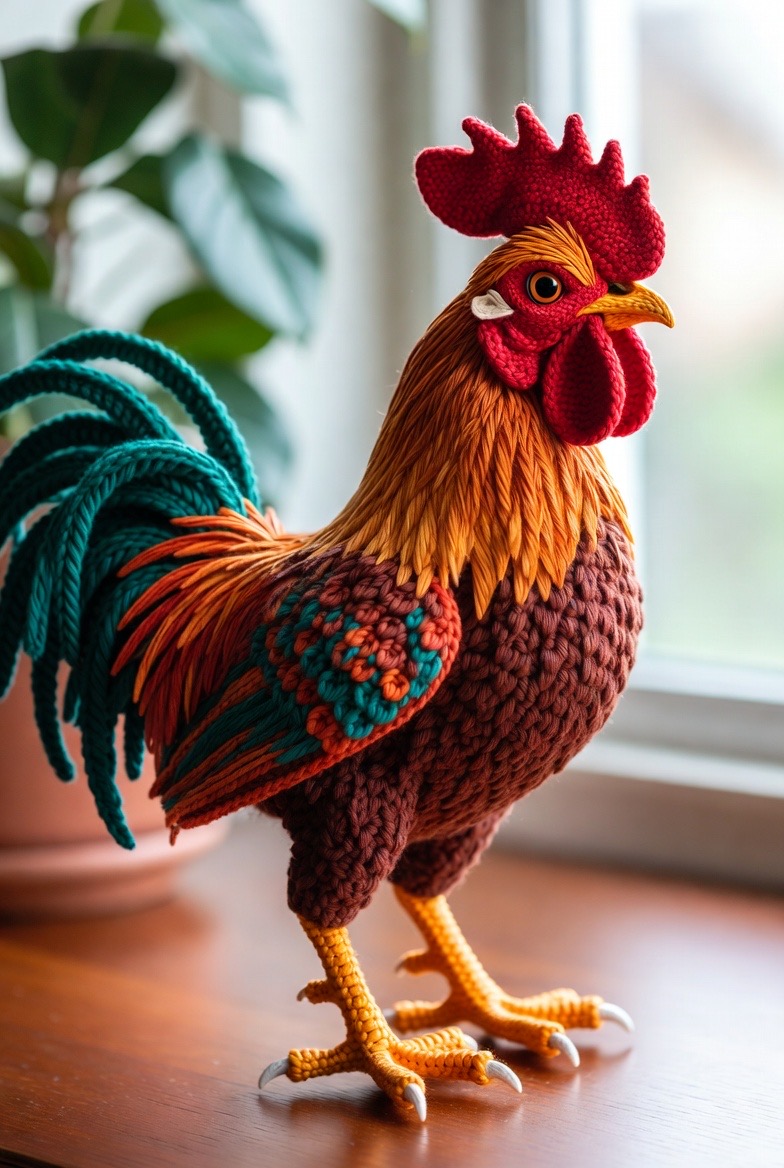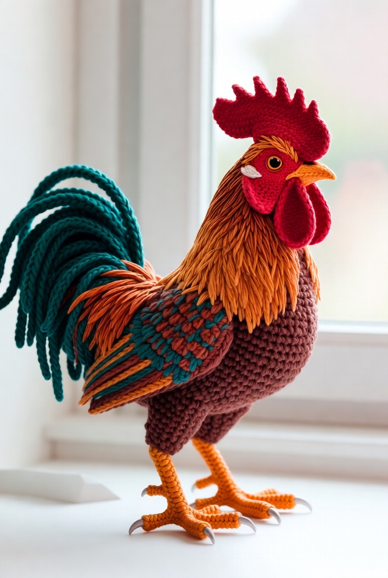 A rooster is the natural alarm clock of the farm, but this crochet version is much quieter and far more colorful. Using vibrant reds, oranges, and deep greens for the tail feathers allows you to play with a bold and exciting color palette. By shaping the comb and the wattle with sharp, clean stitches, you give him a look of regal authority. Standing tall on sturdy, felt-lined legs, he makes a wonderful statement piece for a dining room sideboard or a sun-drenched windowsill in the kitchen. The intricate detail in the feathers provides a great opportunity to show off your stitching skills, making him a proud addition to your barnyard family that never fails to spark a conversation.