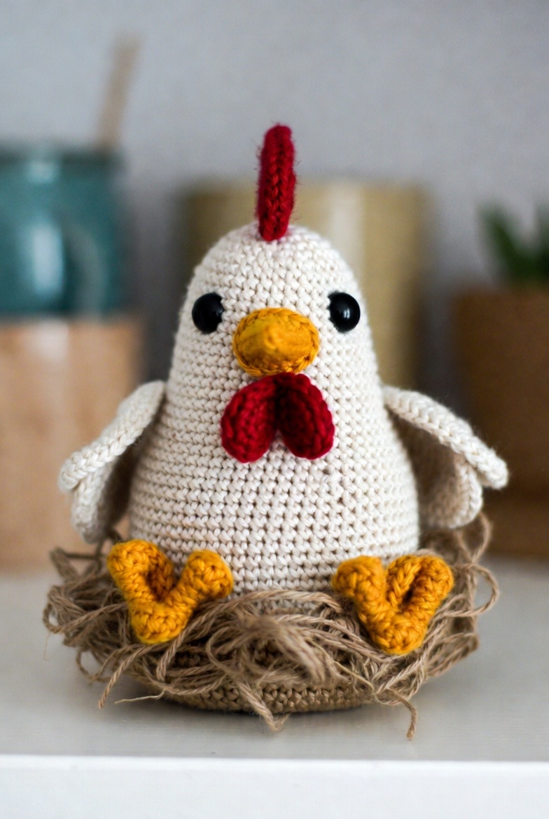 A round, plump hen sitting quietly on her nest is the very epitome of country comfort and domestic peace. You can even crochet a hollow base for this project so she can actually sit on top of small crochet eggs or hidden treasures. Using a speckled or tweed yarn gives her a rustic, feathered look that fits right in with a cottagecore aesthetic or a traditional farmhouse kitchen. She is as much a piece of sophisticated decor as she is a functional toy for storytelling. The details of her red comb and yellow beak provide just enough color to make her pop against the neutral tones of a shelf or a countertop display.
