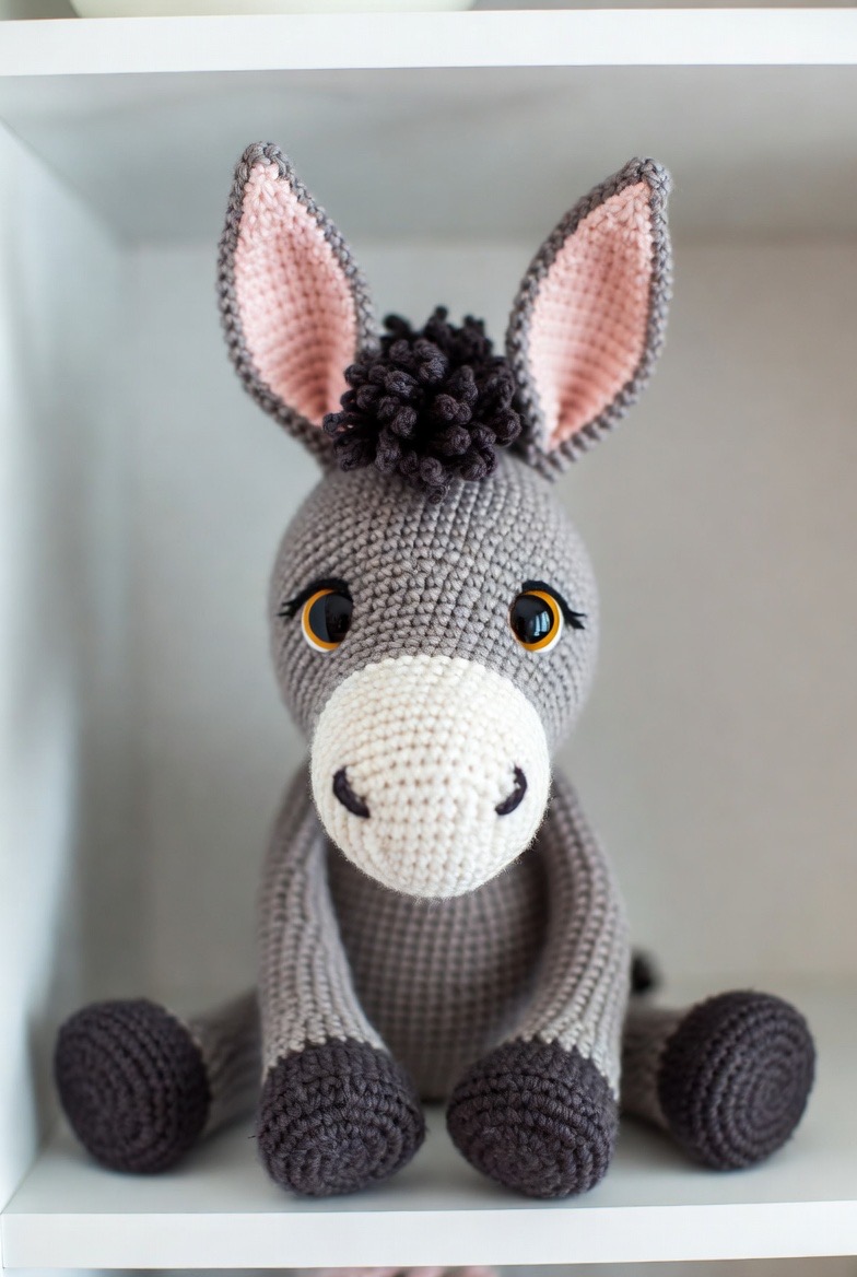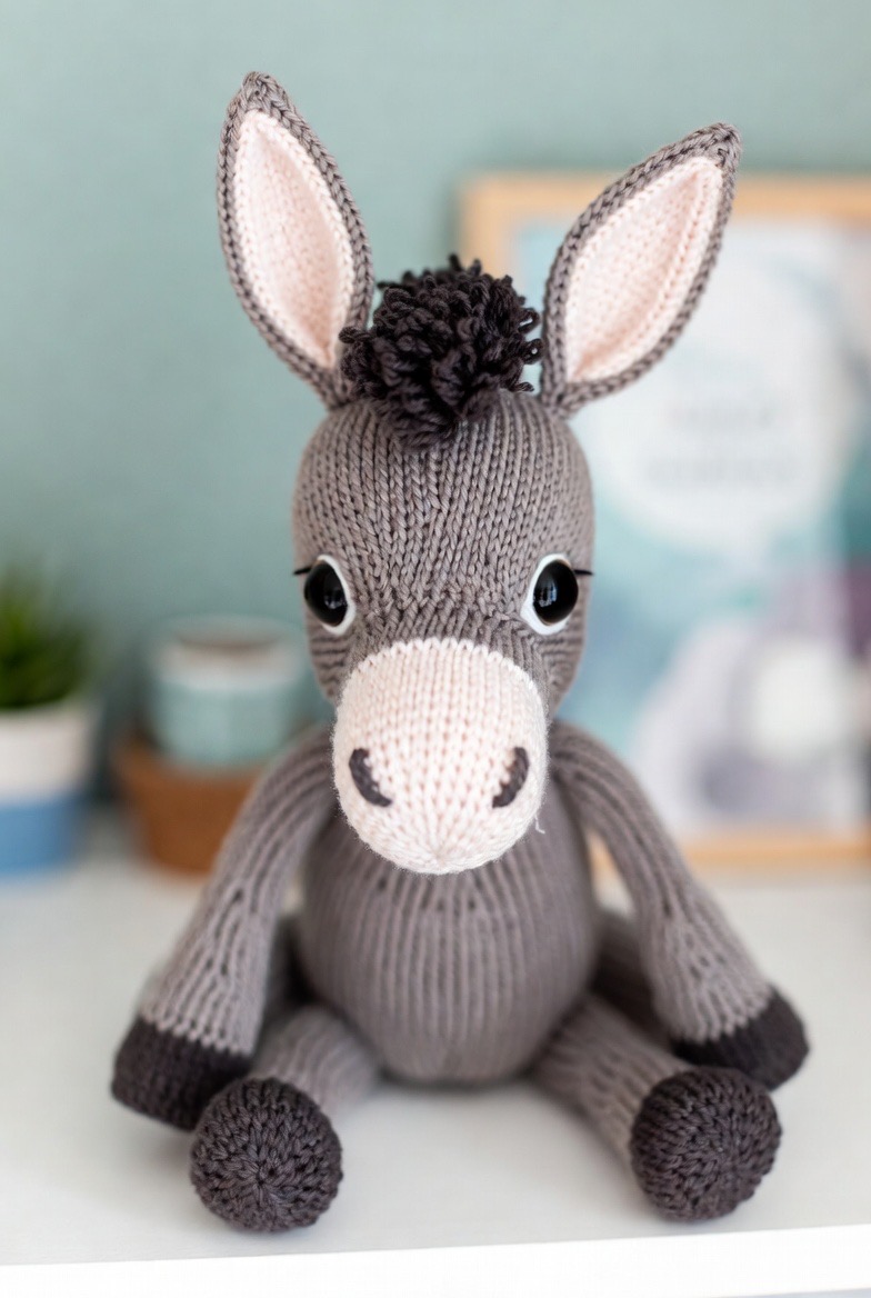 Donkeys have a quiet, sweet charm that is beautifully represented in the soft medium of yarn. With extra-long ears lined in soft pink and a fuzzy black mane made from looped stitches, this donkey looks like he has a lot of gentle stories to tell. He is a wonderful gift for someone who appreciates the slower, more patient side of farm life and the loyalty of a hardworking companion. The gray yarn used for his body provides a wonderful neutral base that allows the smaller details, like his dark hooves and soulful eyes, to really shine. He sits perfectly on a nursery shelf, watching over the room with a calm and protective presence.