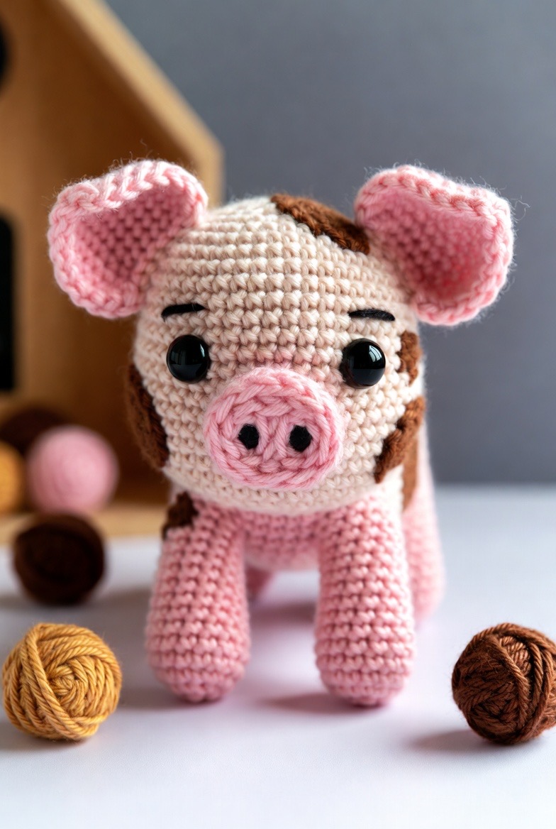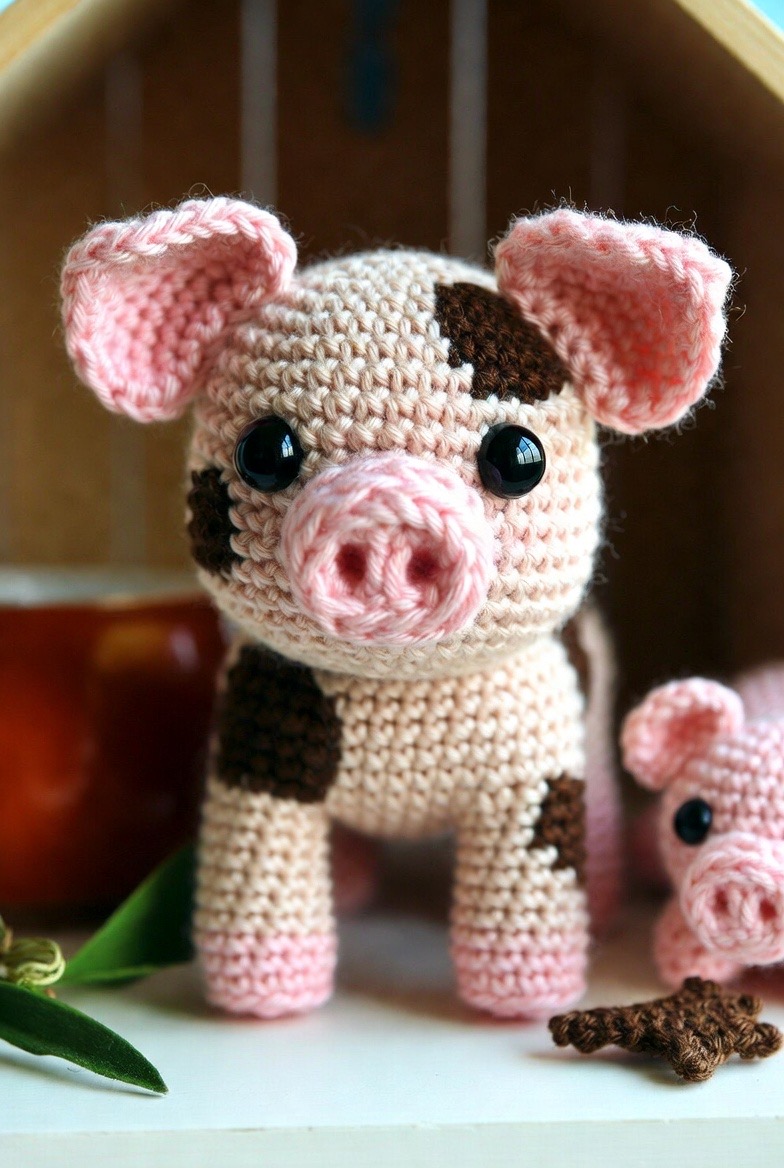 Moving away from the solid pink of the traditional piglet, a spotted pig adds a bit of realistic variety and charm to your barnyard. Using a cream or light tan base with large, irregular brown or black spots makes each pig in the litter entirely unique. It is a fun and creative way to use up different shades of yarn and create a group of animals that looks natural and diverse. These pigs are great for educational play, helping children learn about the different breeds and markings found in nature. Their sturdy shape and friendly faces make them a reliable favorite for both play and display.