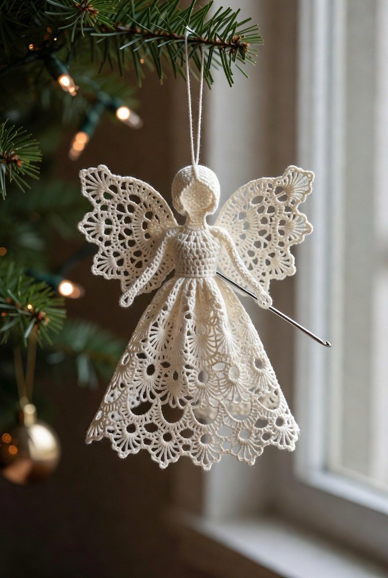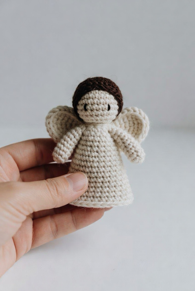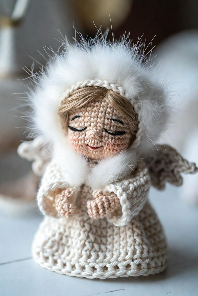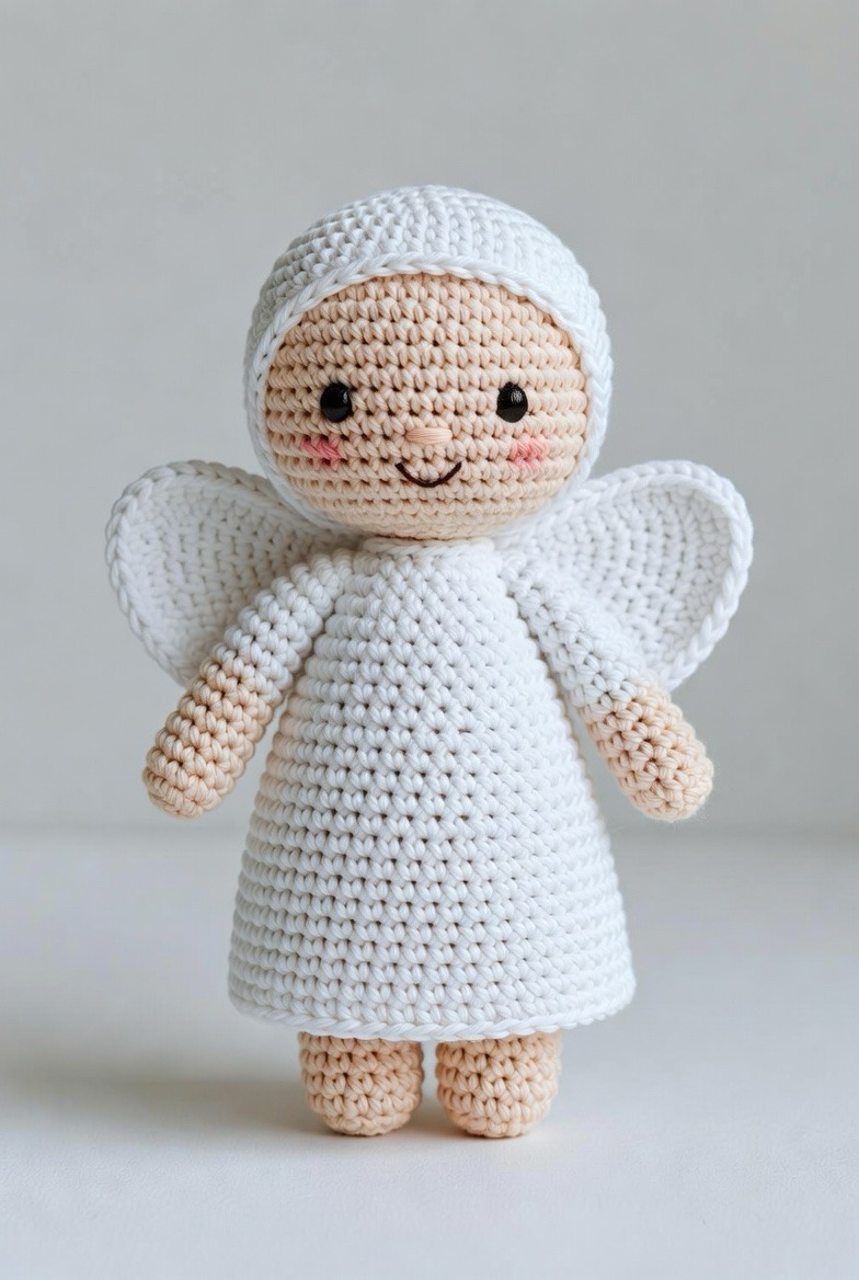 Perfect for the colder months, this design features an angel wearing a tiny crocheted hood or shawl. It adds a layer of coziness and storytelling to the figure. You can use faux fur yarn for the trim of the hood to give it a luxurious, snowy look. This version of the crochet angel feels more like a character from a winter fairytale. It is a great opportunity to play with “bulky” yarn weights for the clothing while keeping the wings delicate and light for a striking visual contrast.