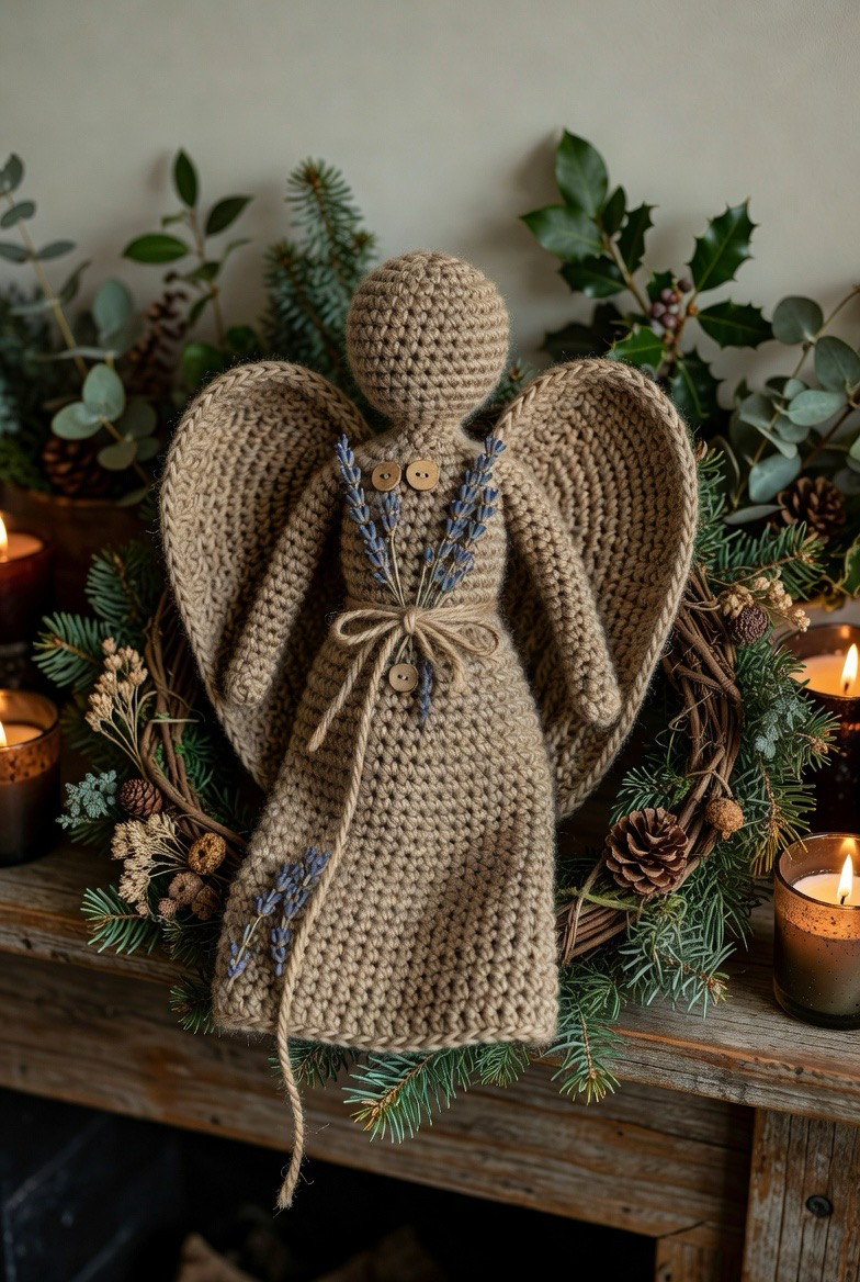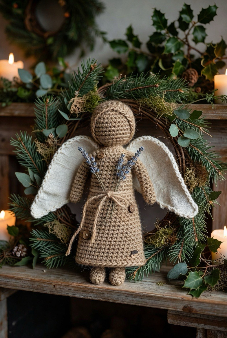 For a more grounded and earthy aesthetic, the farmhouse angel uses natural fibers like jute, hemp, or unbleached linen yarn. The textures are slightly rougher and more tactile than traditional cotton, giving the angel a rustic, handmade charm that fits perfectly with country or primitive decor. You can accent these pieces with small wooden buttons, dried lavender sprigs, or a bit of twine tied in a bow around the waist. They look particularly lovely nestled in a wreath or sitting on a mantelpiece alongside greenery.