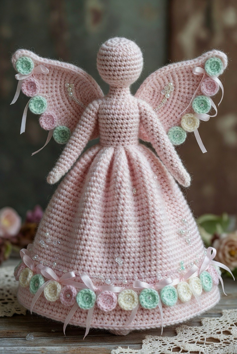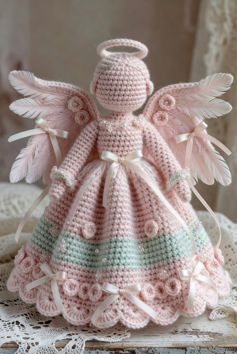 This inspiration focuses on embellishment and texture. The base angel is typically worked in a soft pastel shade like blush pink or mint green. What sets it apart is the addition of tiny crocheted rosettes and ribbons along the hem of the skirt and the tips of the wings. It evokes a Victorian or “shabby chic” vibe that is very popular on Pinterest. You can even incorporate small pearls or clear seed beads into the stitches to mimic the look of morning dew on flower petals, adding a layer of sophistication.