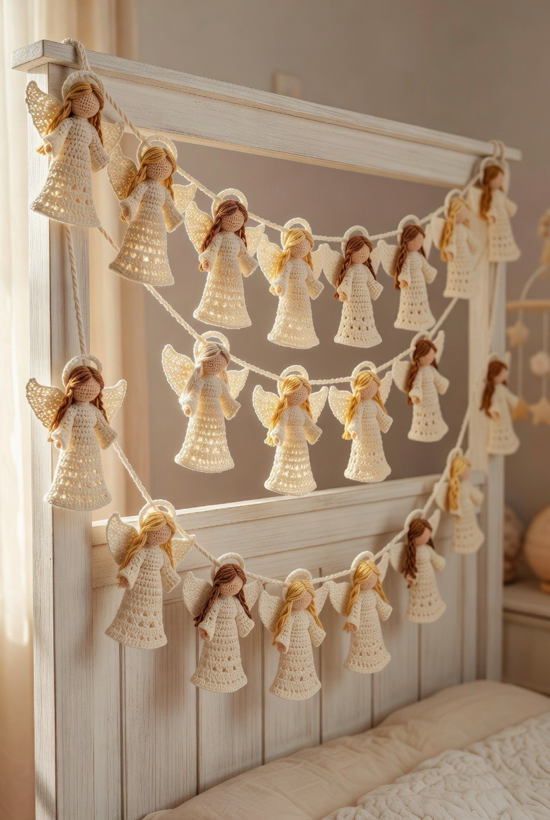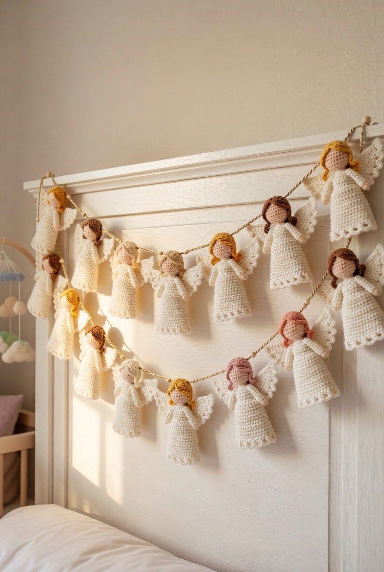 Why stop at just one angel when you can have a whole heavenly host? This project involves crocheting a series of identical flat motifs and stringing them together along a decorative cord. A garland of angels looks spectacular draped across a headboard, a fireplace, or a nursery wall. To keep the project interesting, you can vary the wing shapes or hair colors of each individual angel in the sequence. It is a wonderful way to practice consistency in your tension and stitch work while creating a large scale decor piece.