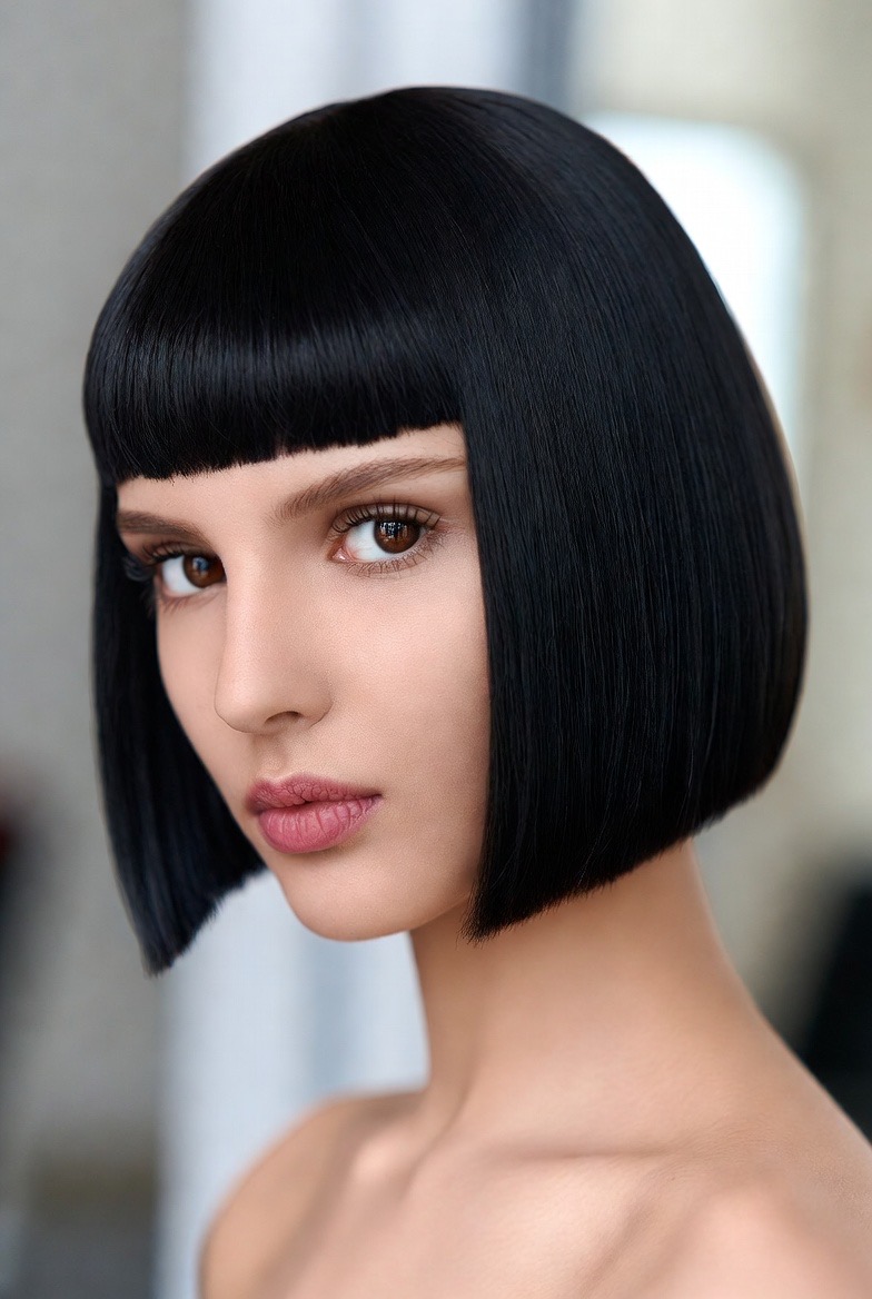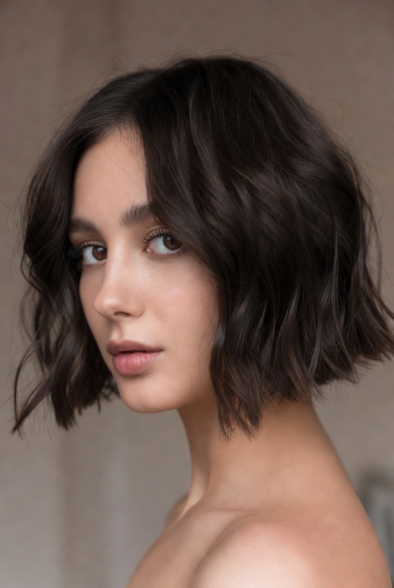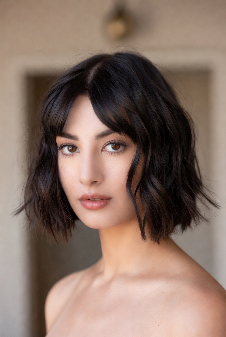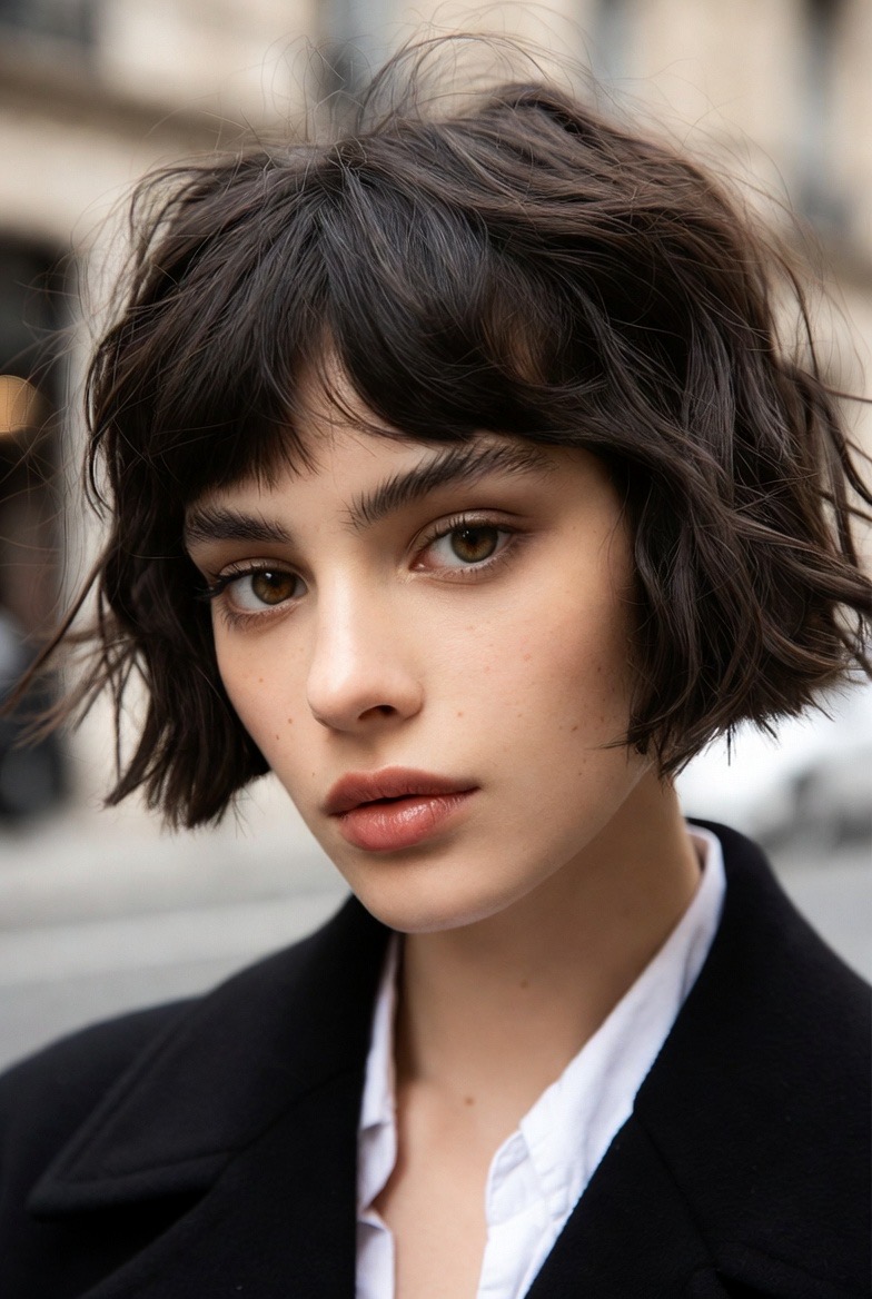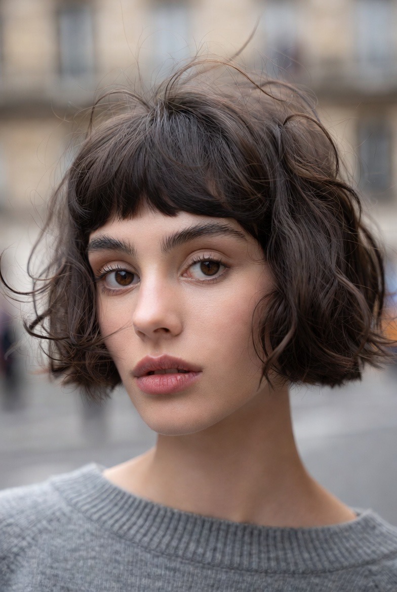 Taking a cue from Parisian street style, this bob is paired with a short, wispy fringe that sits well above the eyebrows. It is intentionally a bit messy and air-dried. This cut is perfect for those who want to highlight their eyes and cheekbones without the commitment of a heavy, blunt bang. It feels lived-in, romantic, and endlessly chic.