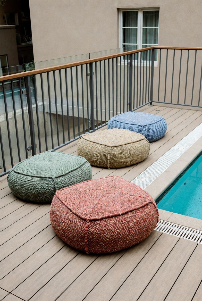 Traditional chairs can feel stiff. Large, weather-resistant floor poufs offer a more relaxed, bohemian vibe. They are easy to move around and provide a soft spot for kids to dry off or for adults to lean back with a book. Look for fabrics with a heavy weave to add a touch of tactile luxury to the poolside.