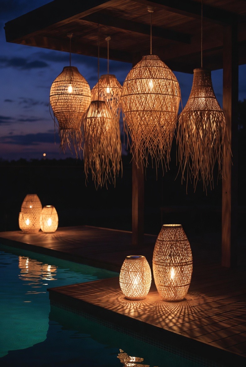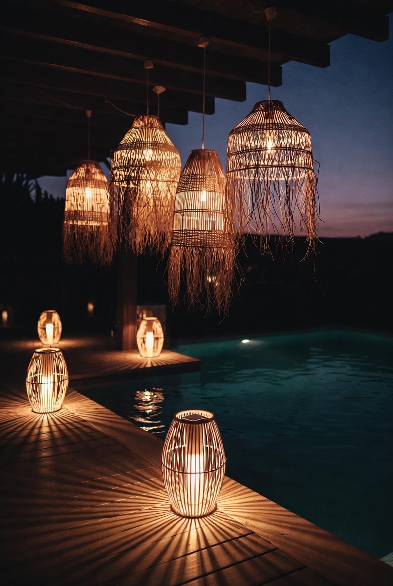 Lighting is the easiest way to transition a pool deck from day to night. Woven lanterns made of synthetic rattan or seagrass look beautiful during the day and cast intricate, dancing shadows across the deck once the sun goes down. Because they are solar-powered, you don’t have to worry about tripping over cords near the water.