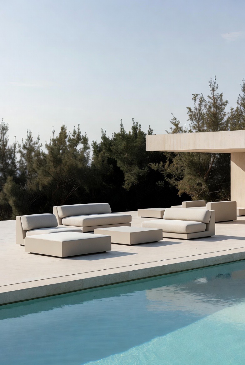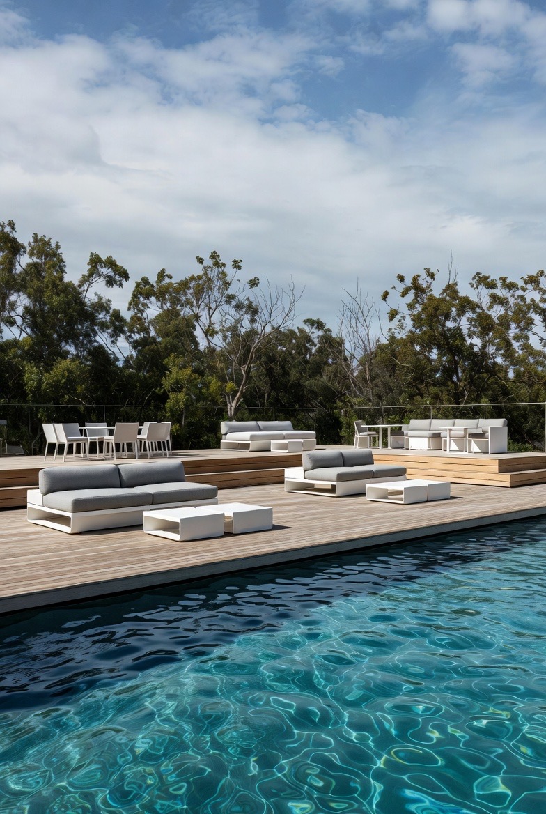 To keep the view of the water unobstructed, choose furniture that sits low to the ground. Modular sections allow you to customize the layout, whether you are hosting a large party or just want a private corner for a nap. Clean lines and neutral tones help the furniture blend into the landscape rather than dominating it.