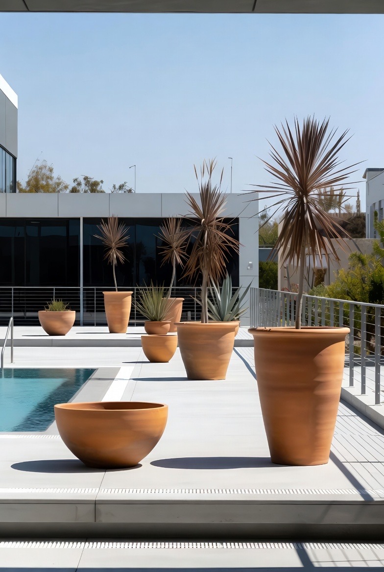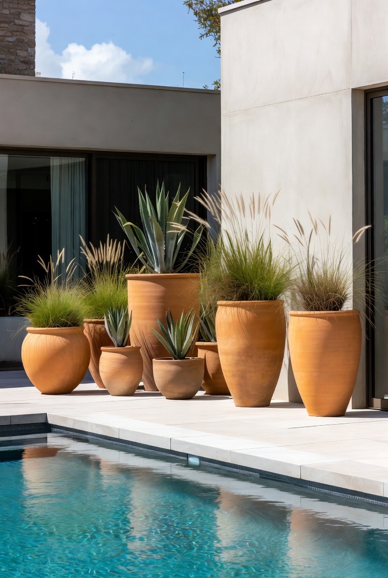 Greenery is essential for softening the hard lines of a pool deck. Using oversized terra cotta planters in varying heights creates a mini-botanical garden effect. Choosing a single type of plant, like tall ornamental grasses or architectural agave, keeps the look modern and sophisticated rather than cluttered.