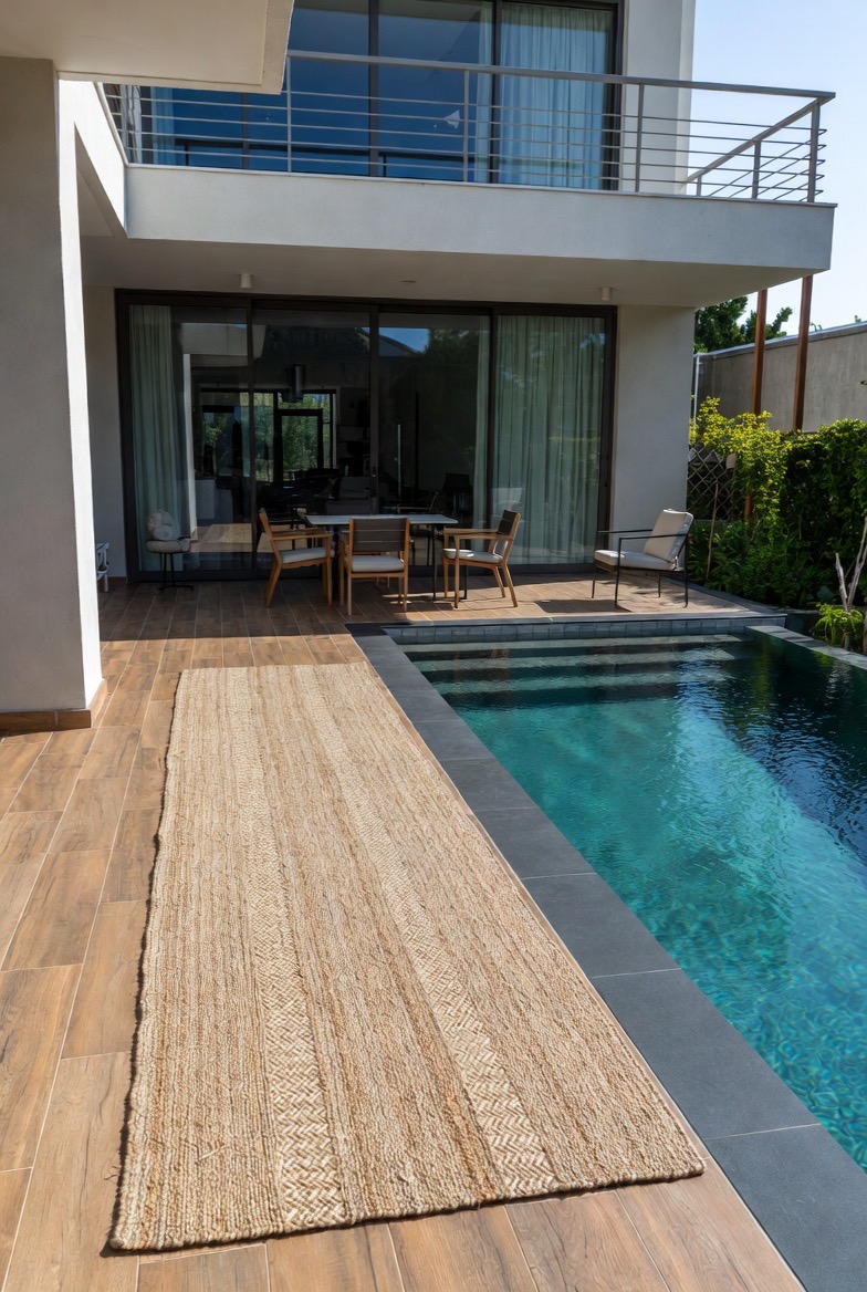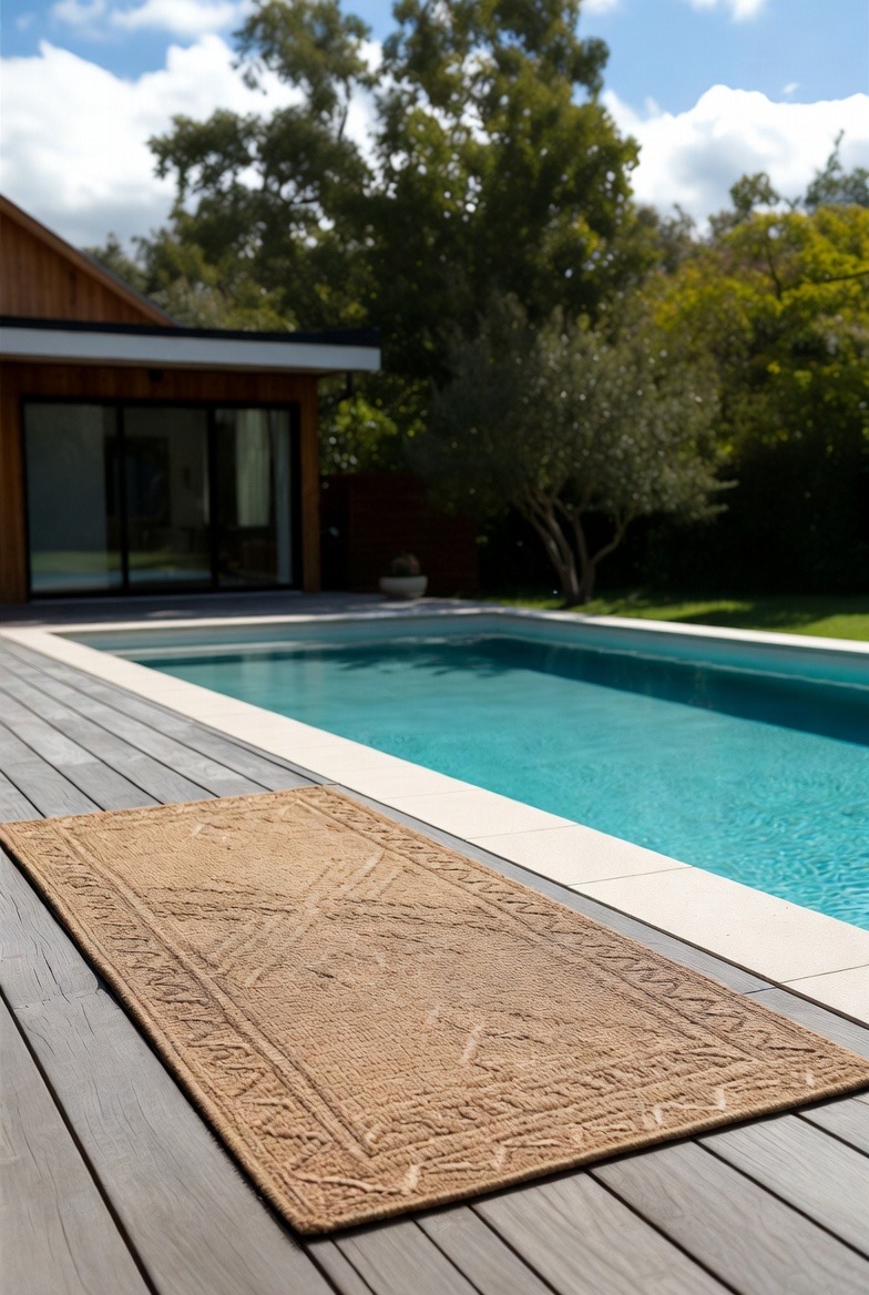 A rug might seem counterintuitive near water, but modern outdoor versions are designed to dry quickly and resist mold. A textured rug in a natural jute-look or a subtle geometric pattern helps define a seating area and protects bare feet from a deck that might get too hot in the midday sun.
