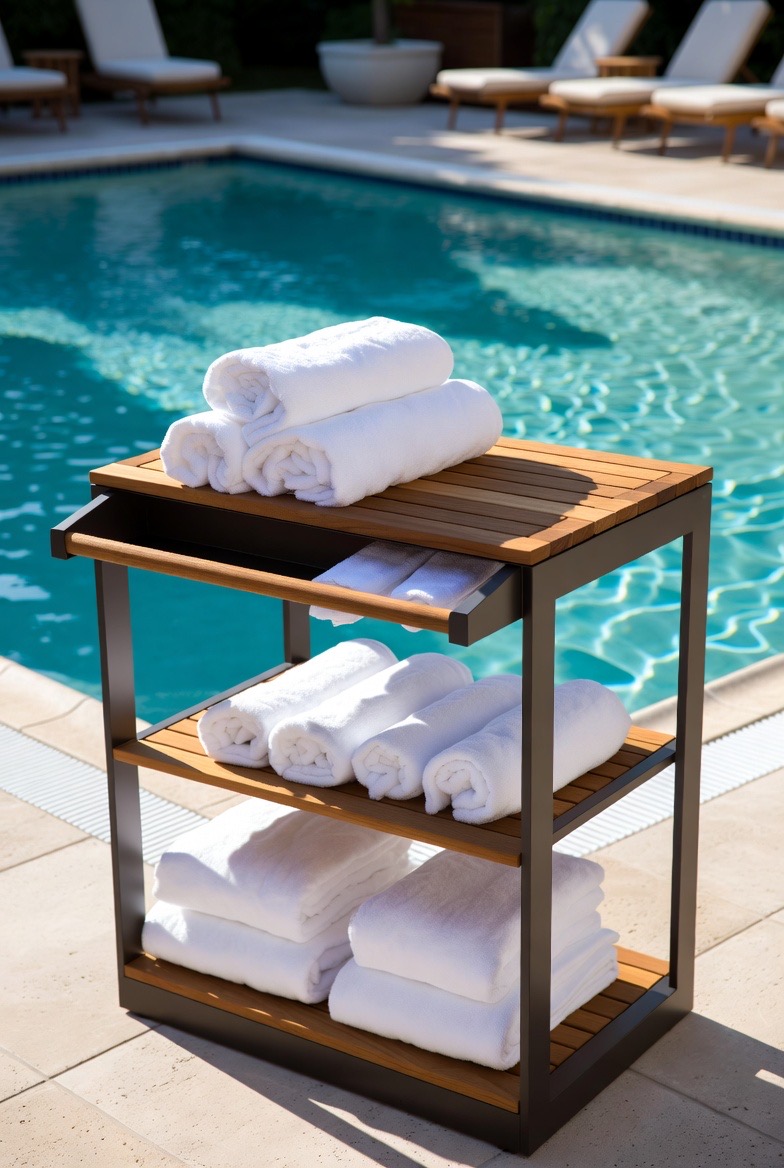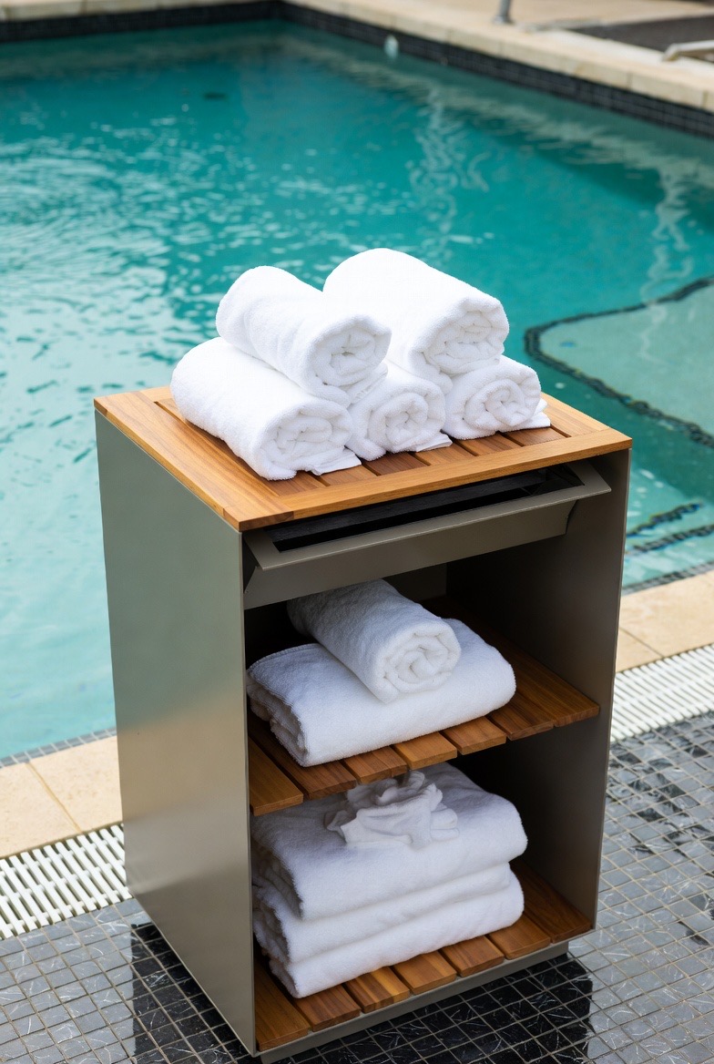 Nothing ruins a luxury vibe faster than a pile of wet, mismatched towels. A dedicated towel valet, made of teak or powder-coated aluminum, keeps everything organized. It provides a specific place for fresh rolls and a hidden basket for used ones, keeping your ‘haven’ looking tidy and intentional.