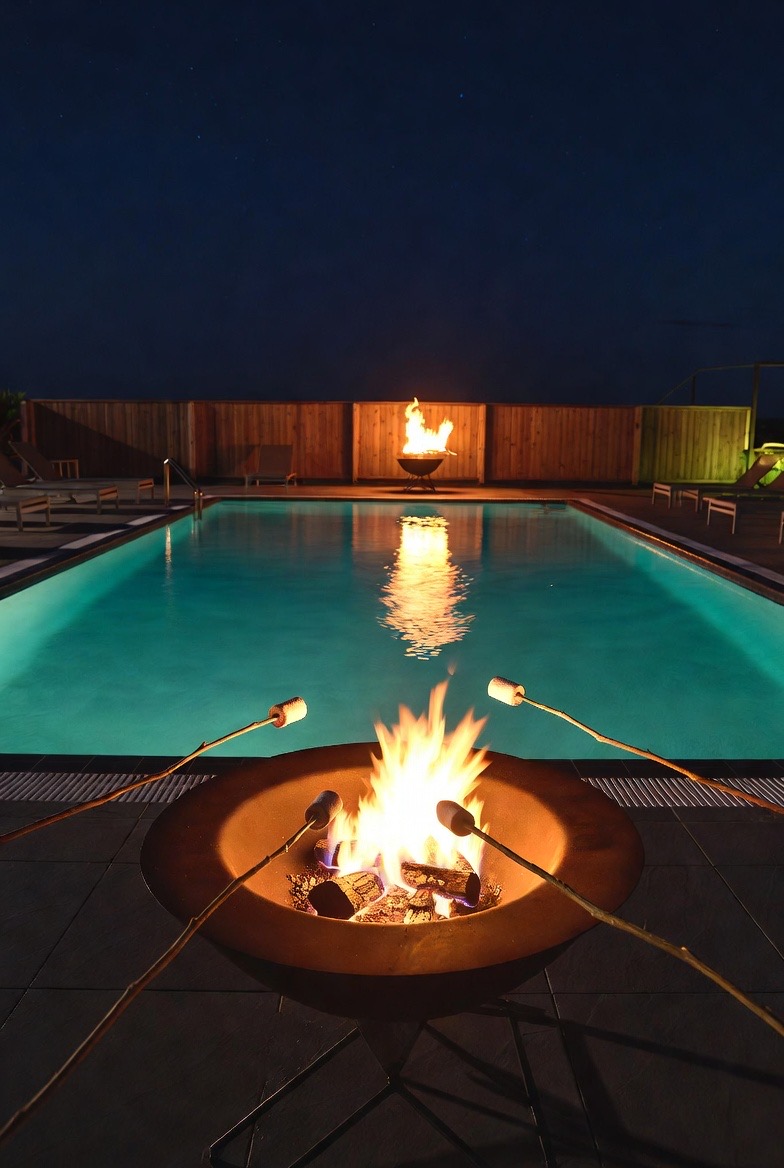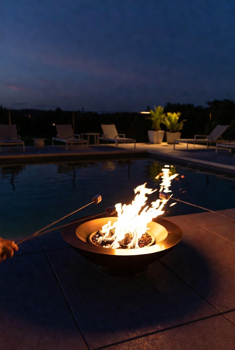 A full-scale fire pit might be too much for some decks, but a low-slung fire bowl provides warmth and a focal point without taking up much space. It is the perfect spot for roasting marshmallows or simply watching the flames reflect off the surface of the pool in the evening.