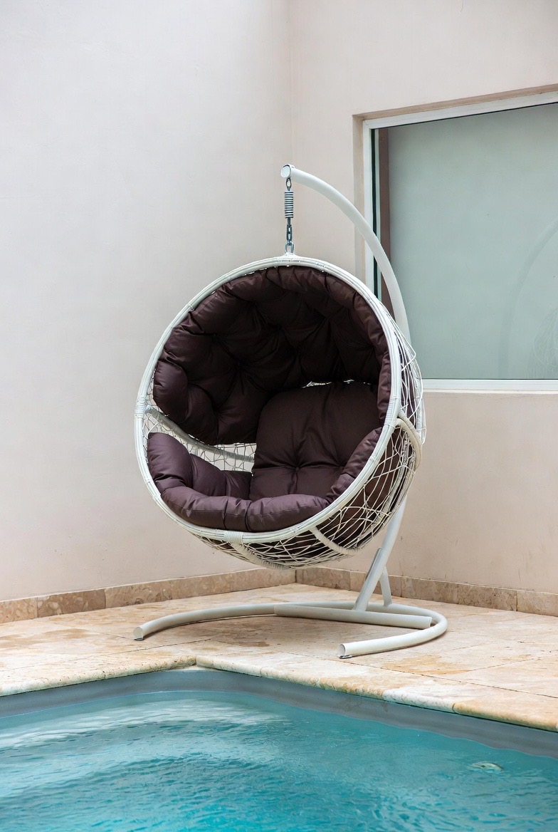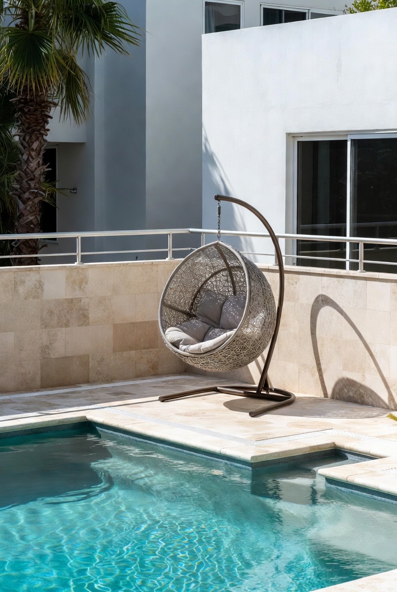 An egg chair suspended from a sturdy stand adds a playful, sculptural element to any corner. It provides a cozy, cocoon-like feeling that is perfect for anyone looking to escape the splash zone for a few minutes of quiet. Plus, the gentle swaying motion is the ultimate in poolside relaxation.