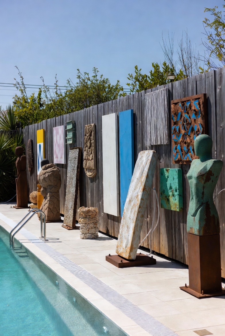 Who says art belongs inside? Weather-proof sculptures or large-scale wall hangings can turn a blank fence or wall into a gallery. Whether it is a minimalist stone piece or a vibrant, water-resistant canvas, it adds a layer of personality that tells guests this space is an extension of your home’s interior style.
