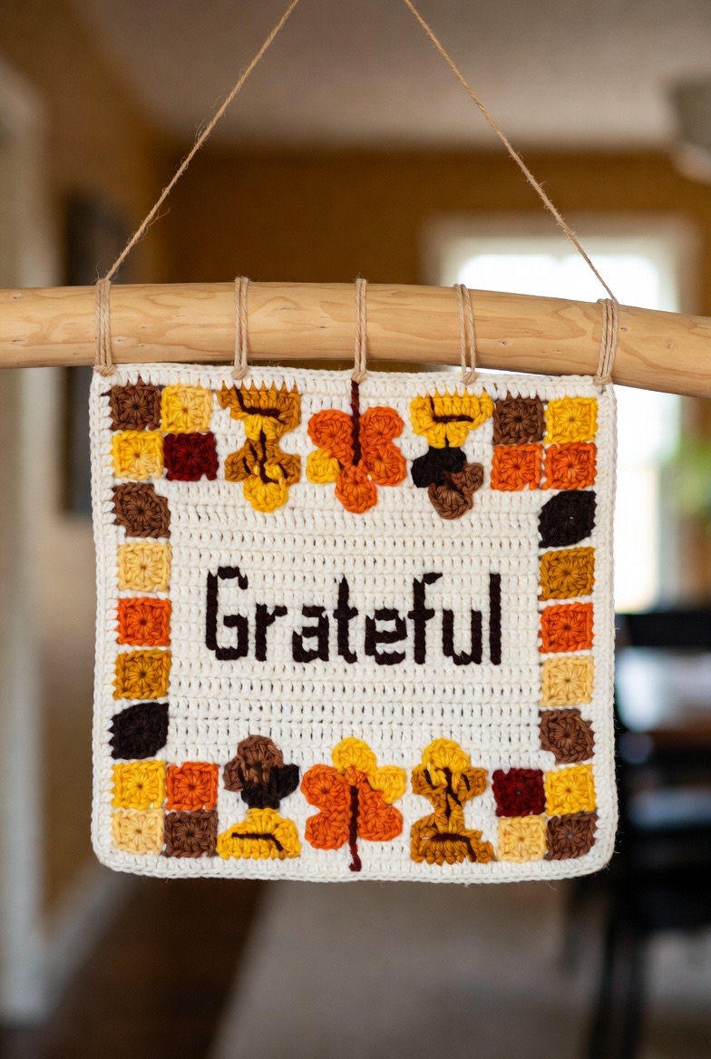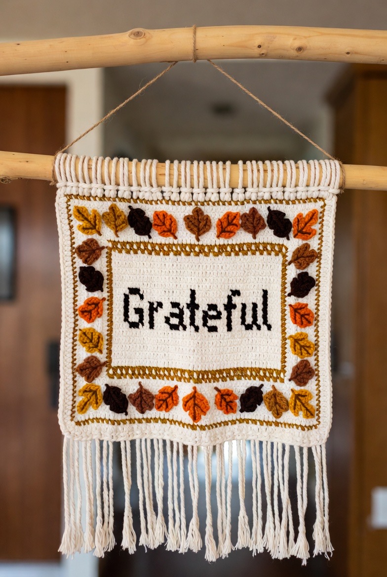 Wall decor is often overlooked during holiday decorating, but a tapestry crochet wall hanging can tie an entire room together. You can use a grid pattern to stitch the word ‘Grateful’ or ‘Thankful’ into a rectangular piece, surrounded by a border of autumn leaves or geometric patterns. Hanging the finished piece from a natural wooden dowel or a smooth branch from the backyard adds an organic, earthy feel to the design. It serves as a daily visual prompt to focus on the positive, making it a meaningful addition to your hallway or dining area during the month of November.