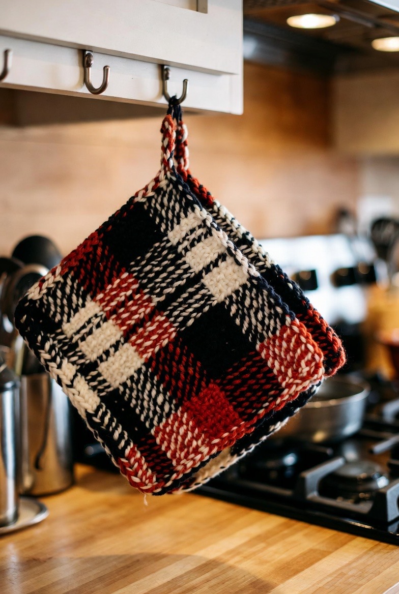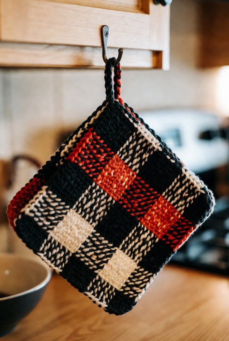 Function meets fashion with these heavy-duty plaid pot holders. Thanksgiving cooking often involves a lot of hot dishes moving from the oven to the table, and having a set of thick, cotton pot holders is essential. By using the carrying-yarn technique to create a buffalo check or traditional tartan pattern, you create a piece that is both durable and stylish. They look beautiful hanging from a hook in the kitchen, adding a touch of cozy cabin vibes to your prep space. Plus, they are a great way to practice color-work without the commitment of a full-sized blanket.